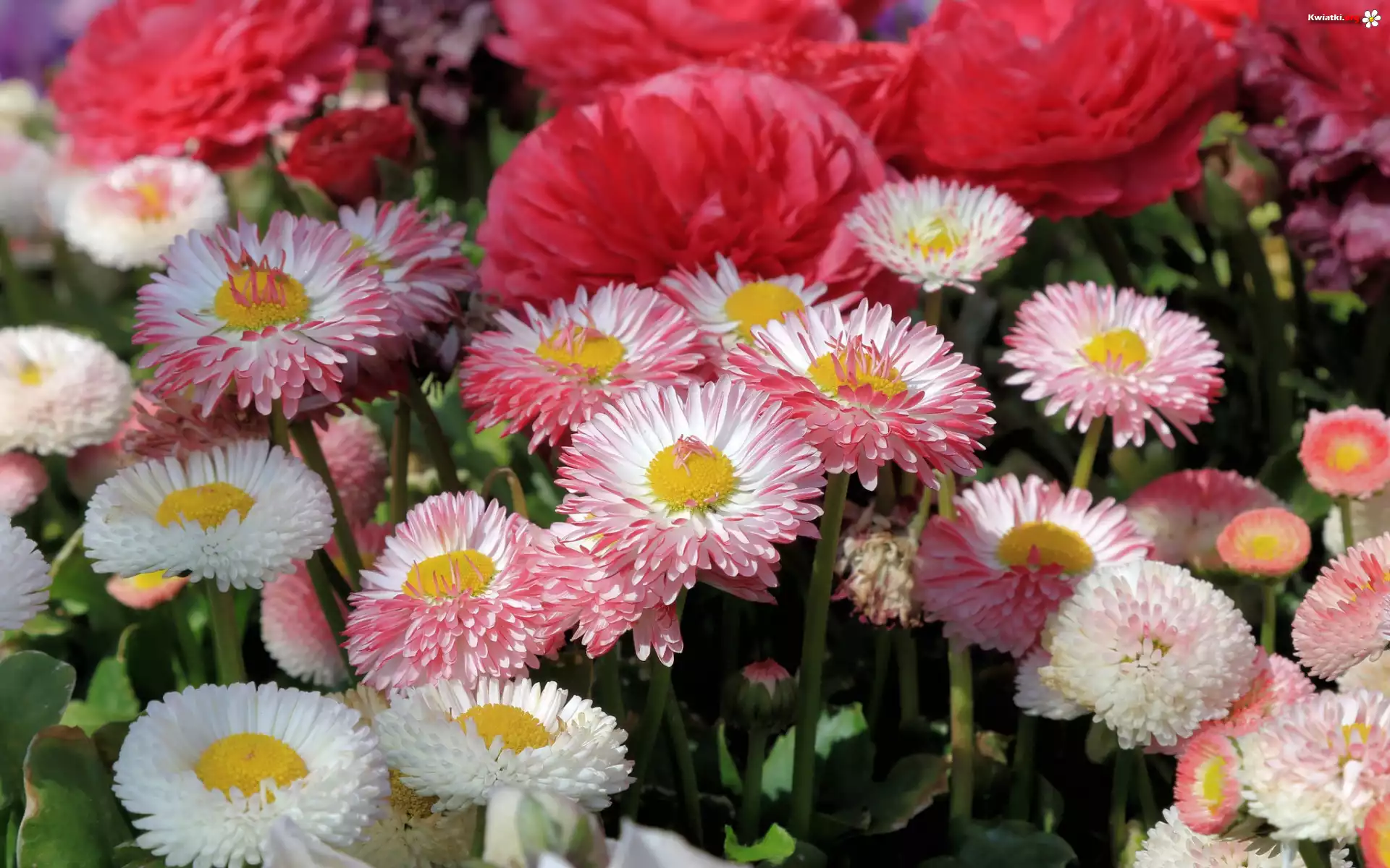 Kwiaty, Czerwone, Stokrotki, Różowe, Kwitnące - Zdjęcia