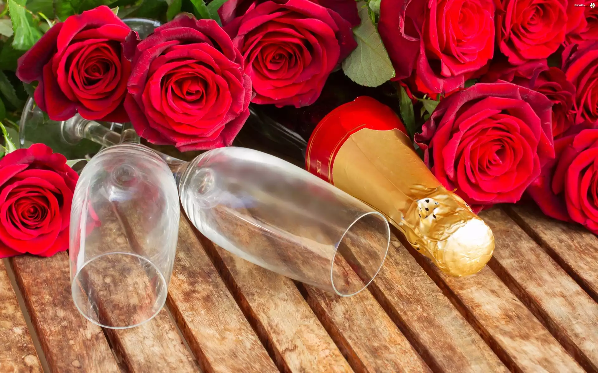 Czerwone, Róże, Szampan, Kieliszki - Zdjęcia