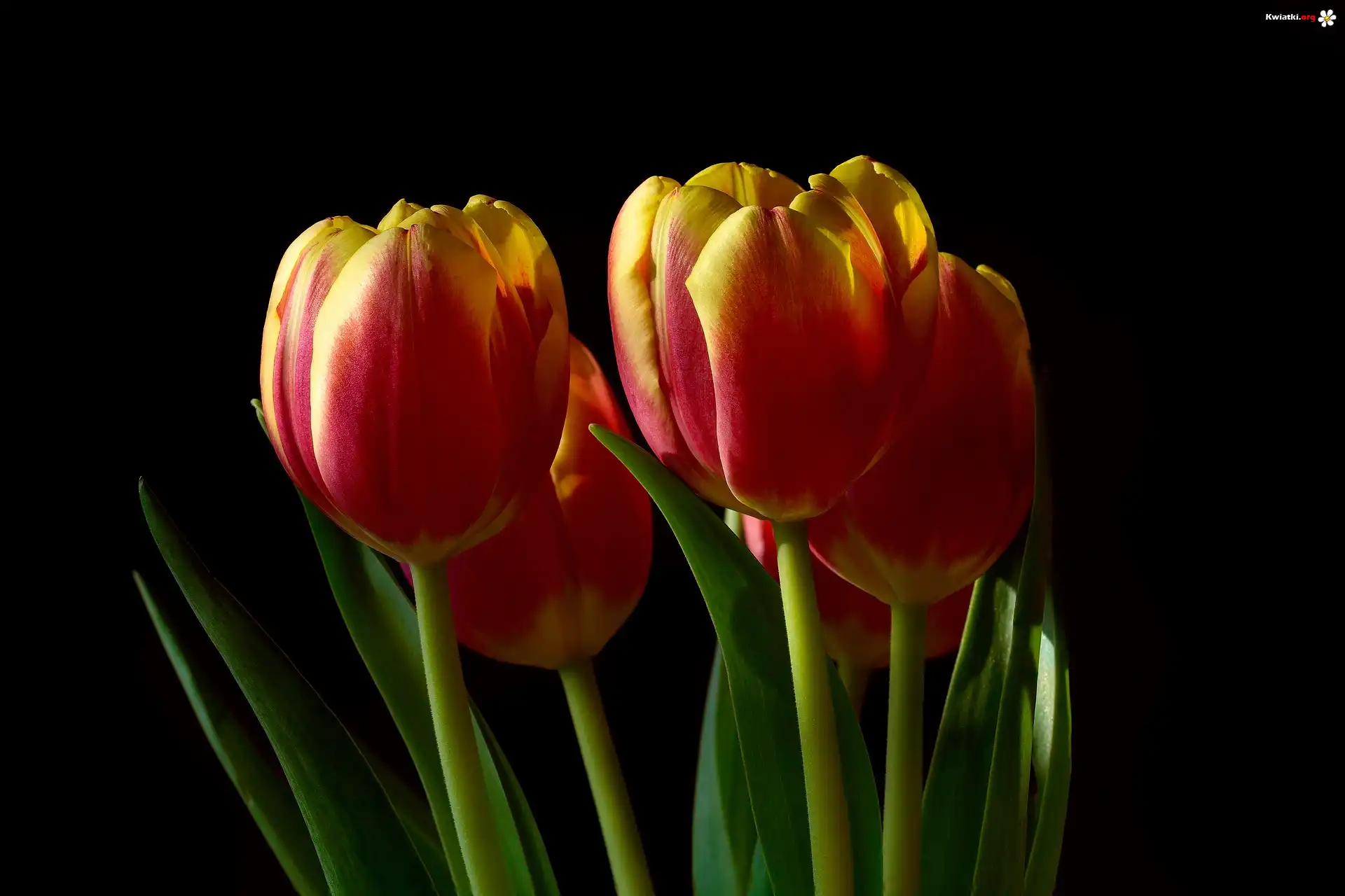 Czerwono-żółte, Tulipany, Ciemne tło - Zdjęcia