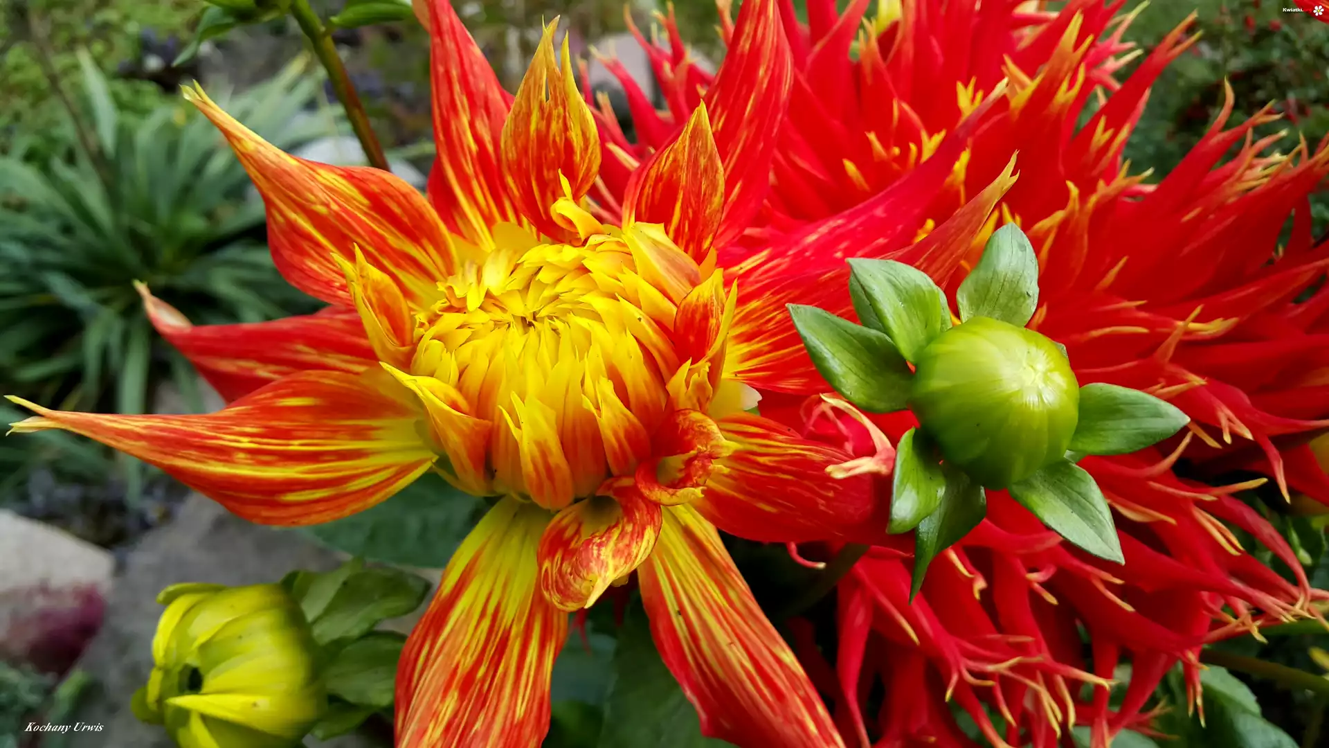 Czerwono, Żółta, Dalia, Pąki - Zdjęcia