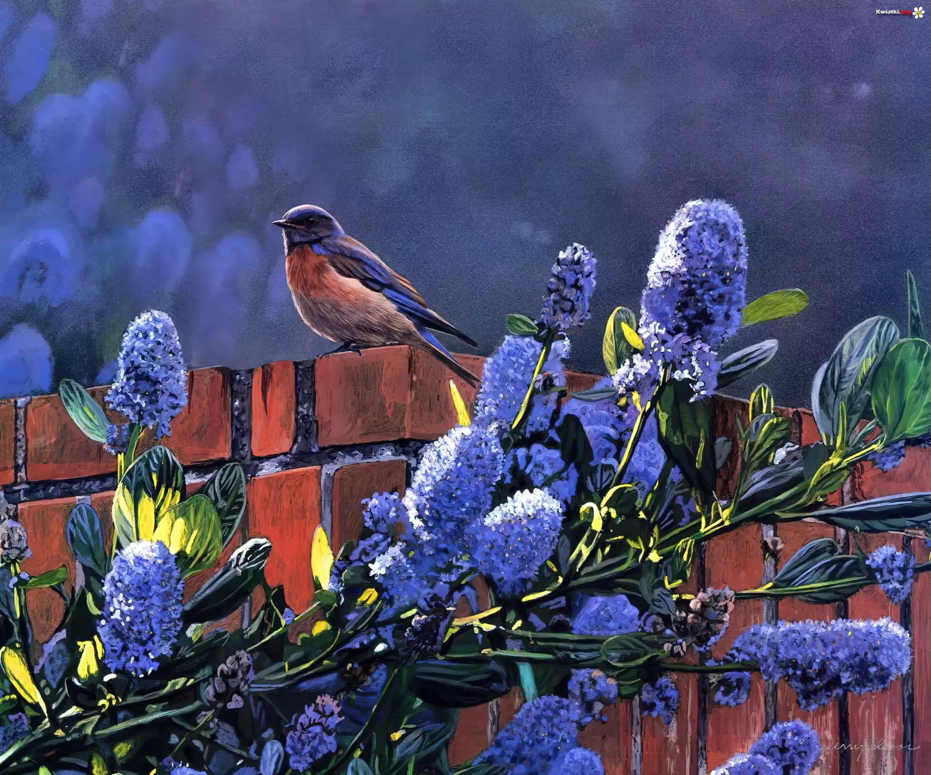 Kwiat Czerwono, Niebieski, Ptak, Mur, Liliowe, Kwiaty