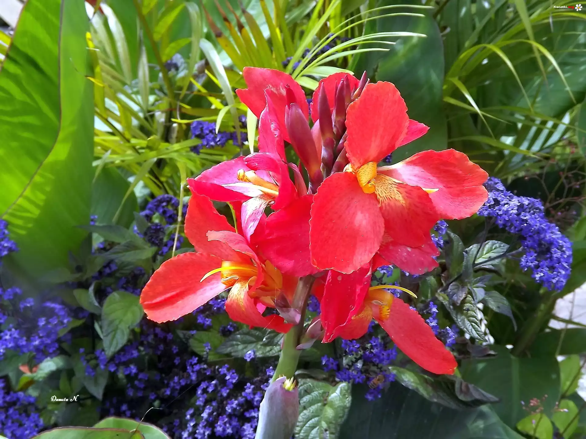 Paciorecznik, Czerwony, Kwiatki, Niebieskie, Liście, Ogród, Lato Paciorecznik, Czerwony, Japońska, Rozplenica, Liście, Trawy Paciorecznik Kanna, Żółta, Nakrapiana Paciorecznik Kanna, Łodyga, Liście Kwiaty, Kolory Czerwone, Kwiaty Kwiat, Paciorecznika, Złocistego