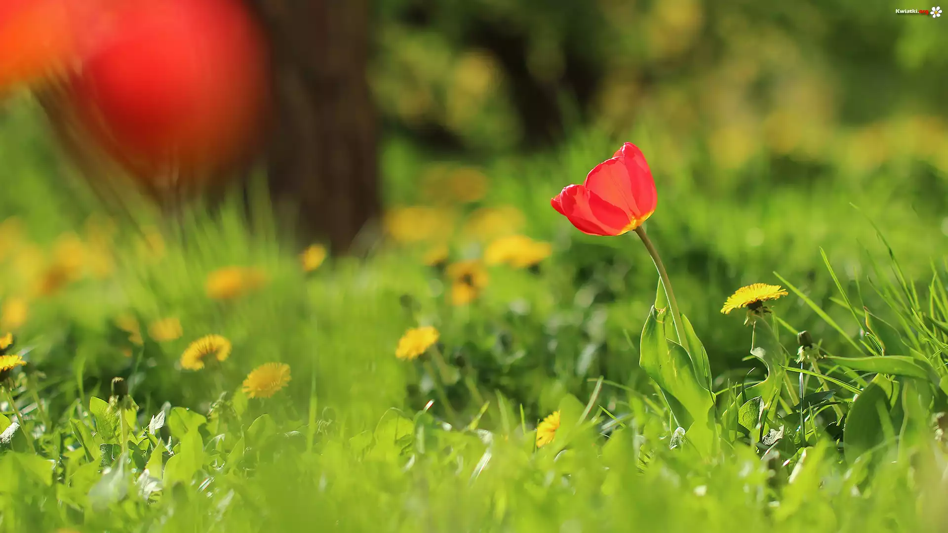 Kwiat Czerwony, Tulipan, Mniszki, Trawa, Rośliny