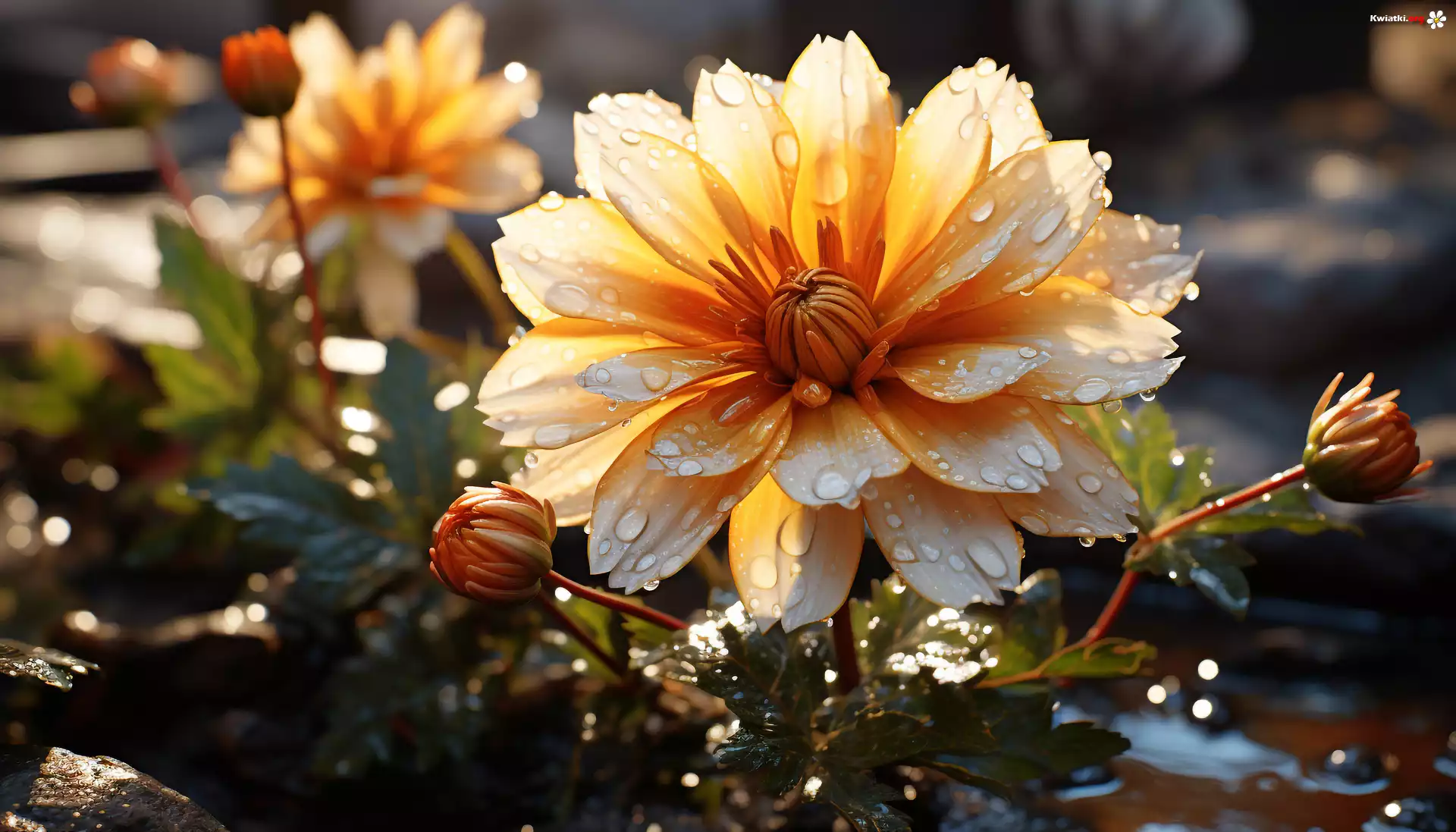 Kwiat Kwiaty, Dalia, Krople, Światło, Grafika