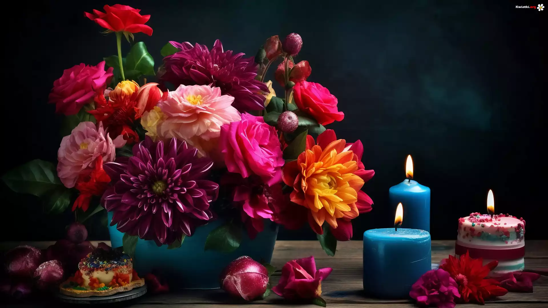 Bukiet, Kwiaty, Róże, Dalie, Świece, Ciemne tło - Zdjęcia