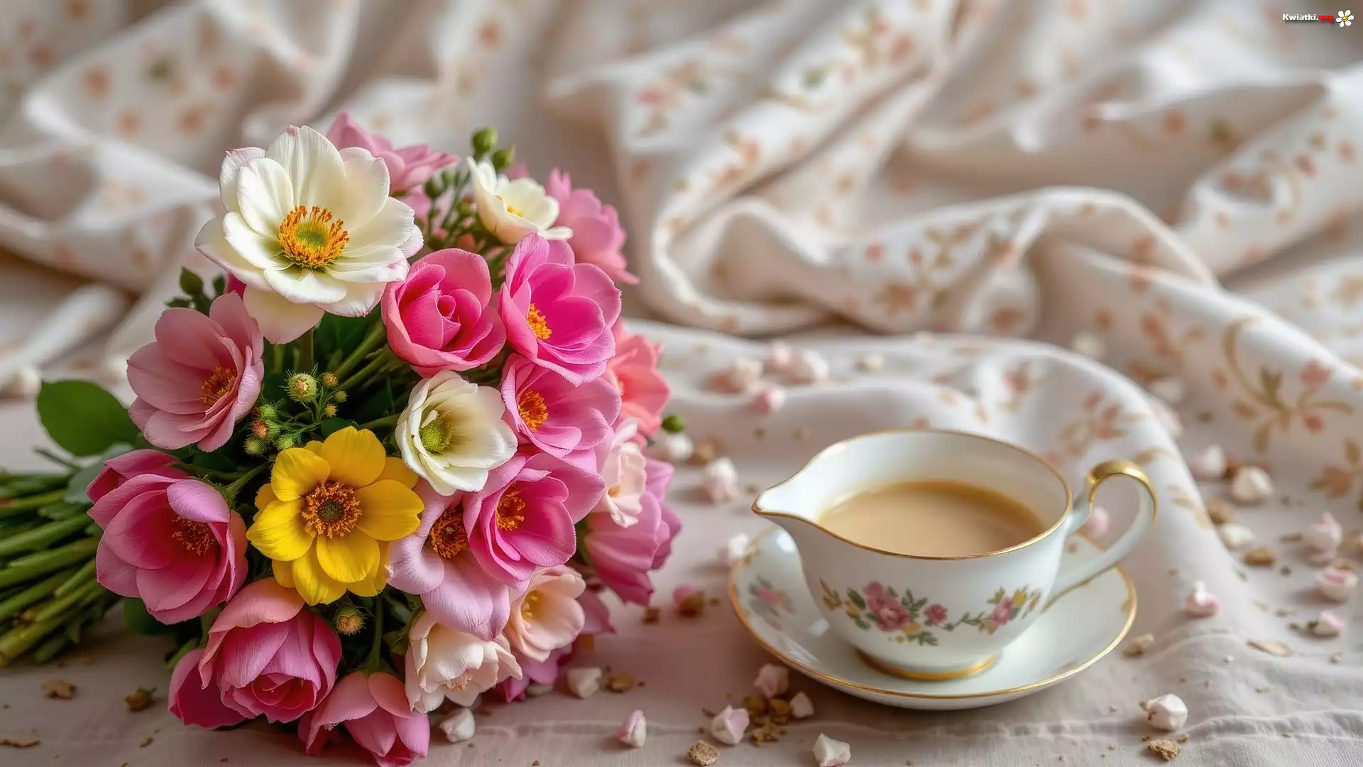 Różowe, Białe, Kwiaty, Bukiet, Filiżanka, Kawa, Płótno, Dekoracja - Zdjęcia