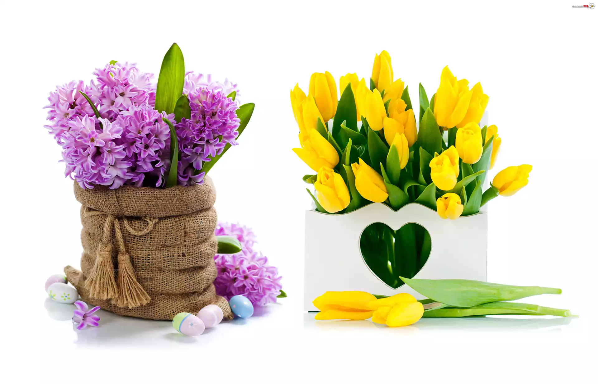 Kwiat Wielkanoc, Dekoracja, Żółte Tulipany, Skrzynka, Hiacynty, Worek, Pisanki