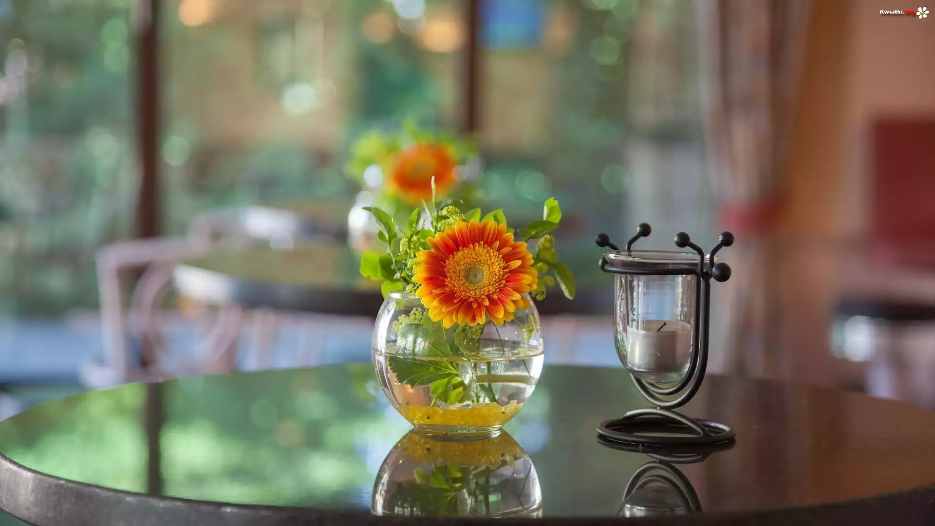 Dekoracja, Wazonik, Gerbera, Świeczka, Rozmyte tło - Zdjęcia