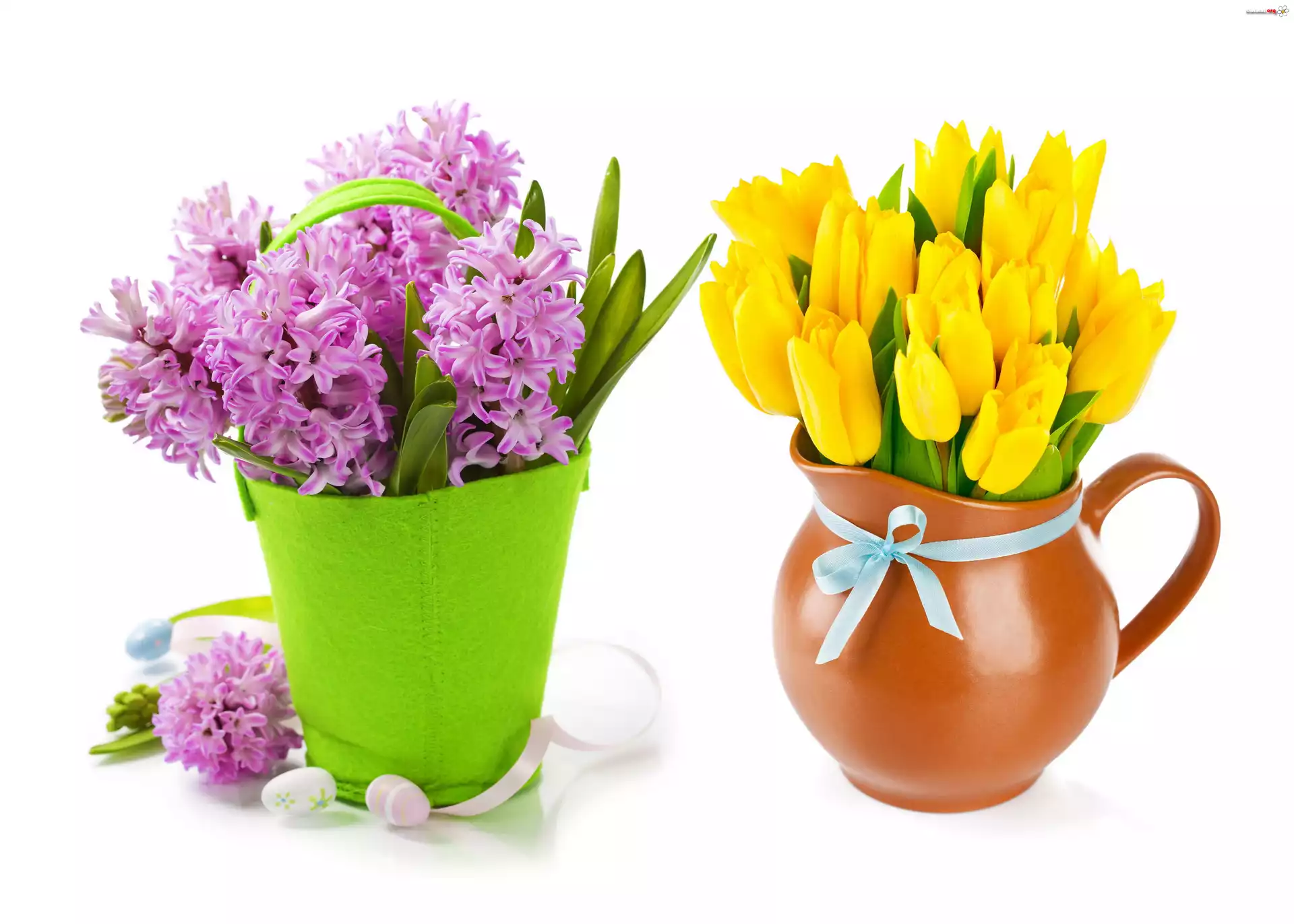 Kwiat Wielkanocna, Dekoracja, Hiacynty, Tulipany, Wiaderko, Dzbanek, Pisanki