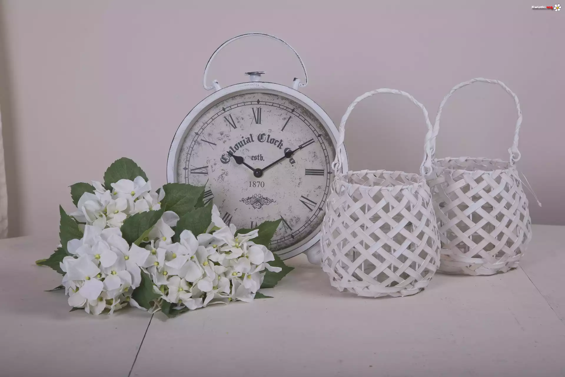 Dekoracje, Zegar, Koszyczki, Hortensja - Zdjęcia