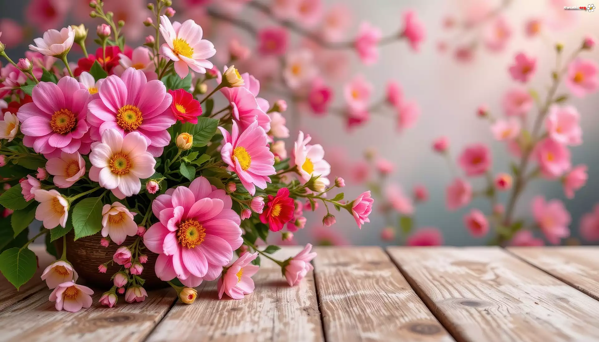 Różowe, Kwiaty, Bukiet, Deski, Grafika AI - Zdjęcia