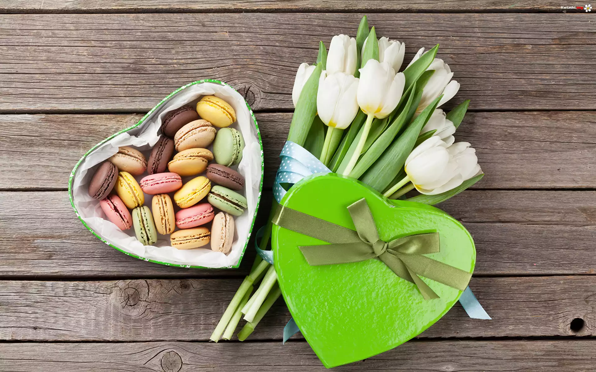 Serce, Pudełko, Ciastka, Makaroniki, Kwiaty, Białe, Tulipany, Deski - Zdjęcia