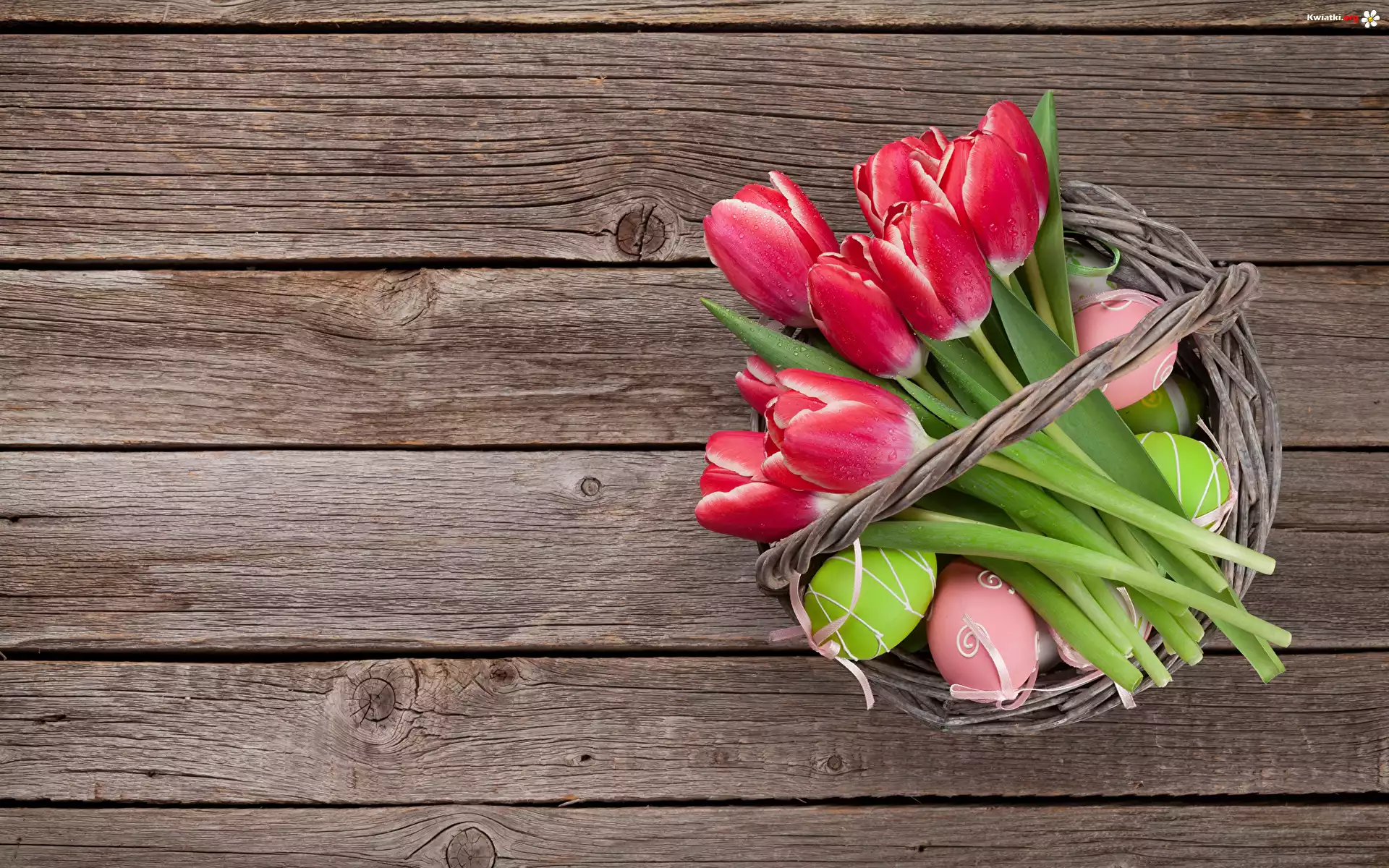 Kwiat Wiklinowy, Koszyk, Czerwone, Tulipany, Kolorowe, Pisanki, Wielkanoc, Deski