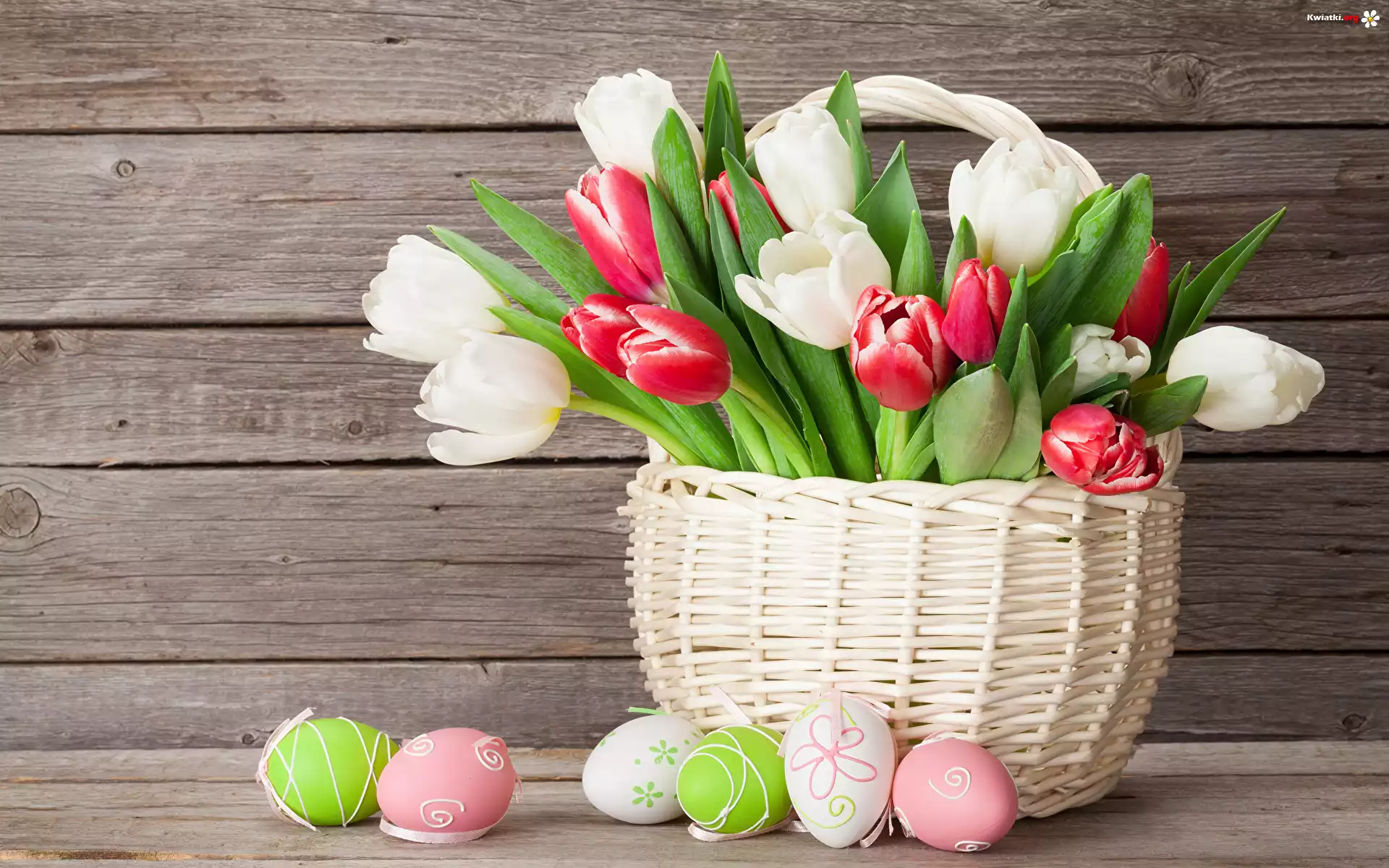 Biały, Koszyk, Kwiaty, Białe, Czerwone, Tulipany, Pisanki, Deski - Zdjęcia
