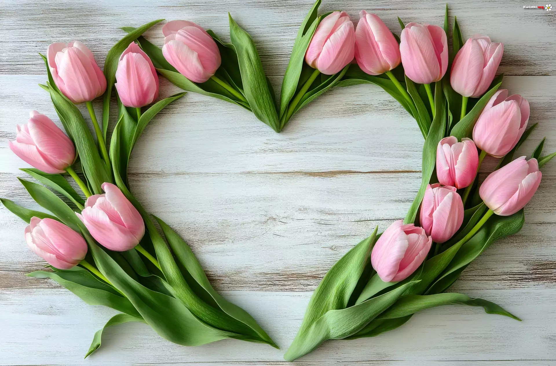 Różowe, Tulipany, Serce, Deski - Zdjęcia