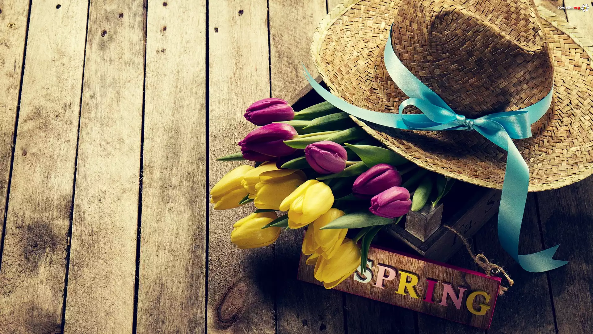 Kapelusz, Niebieska, Wstążka, Bukiet, Tulipany, Drewniana, Tabliczka, Napis, Spring, Deski - Zdjęcia |