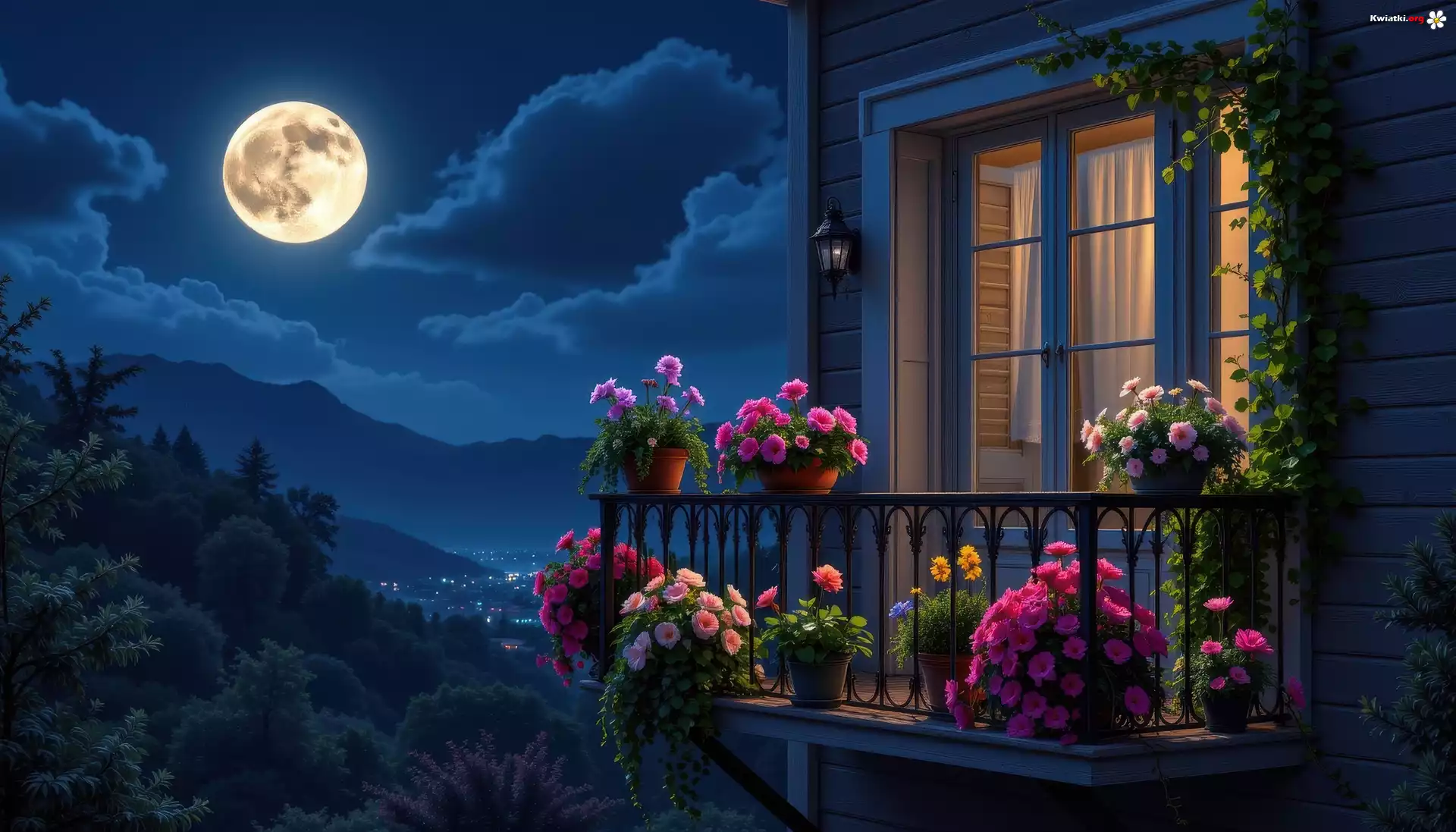 Noc, Kwiaty, Doniczki, Dom, Balkon, Grafika - Zdjęcia