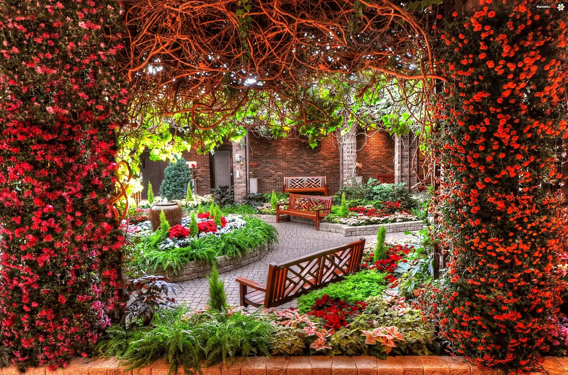 Kwiat Dom, Patio, Ławki, Klomb, Kwiaty
