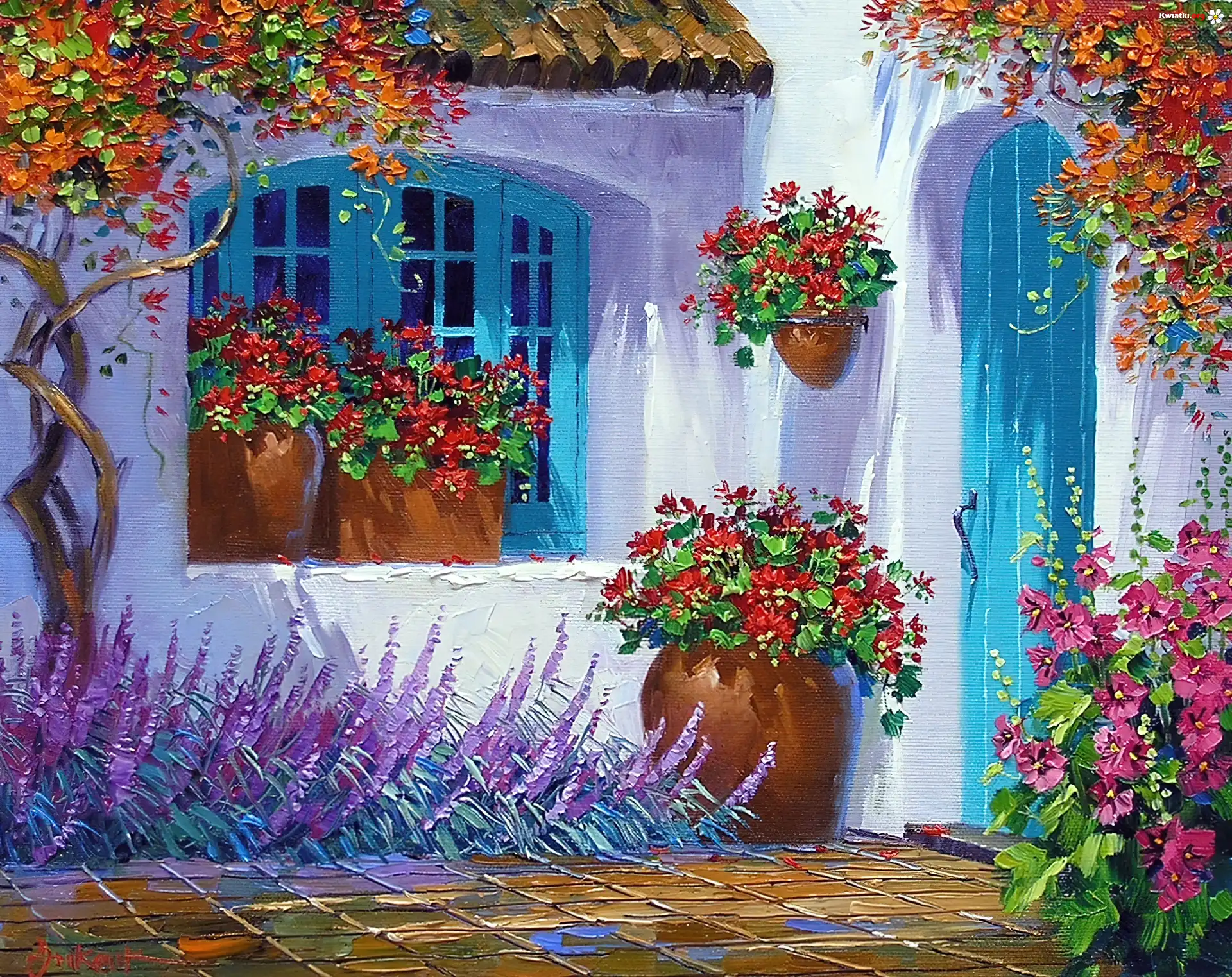 Dom, Niebieskie, Drzwi, Okno, Kwiaty - Zdjęcia