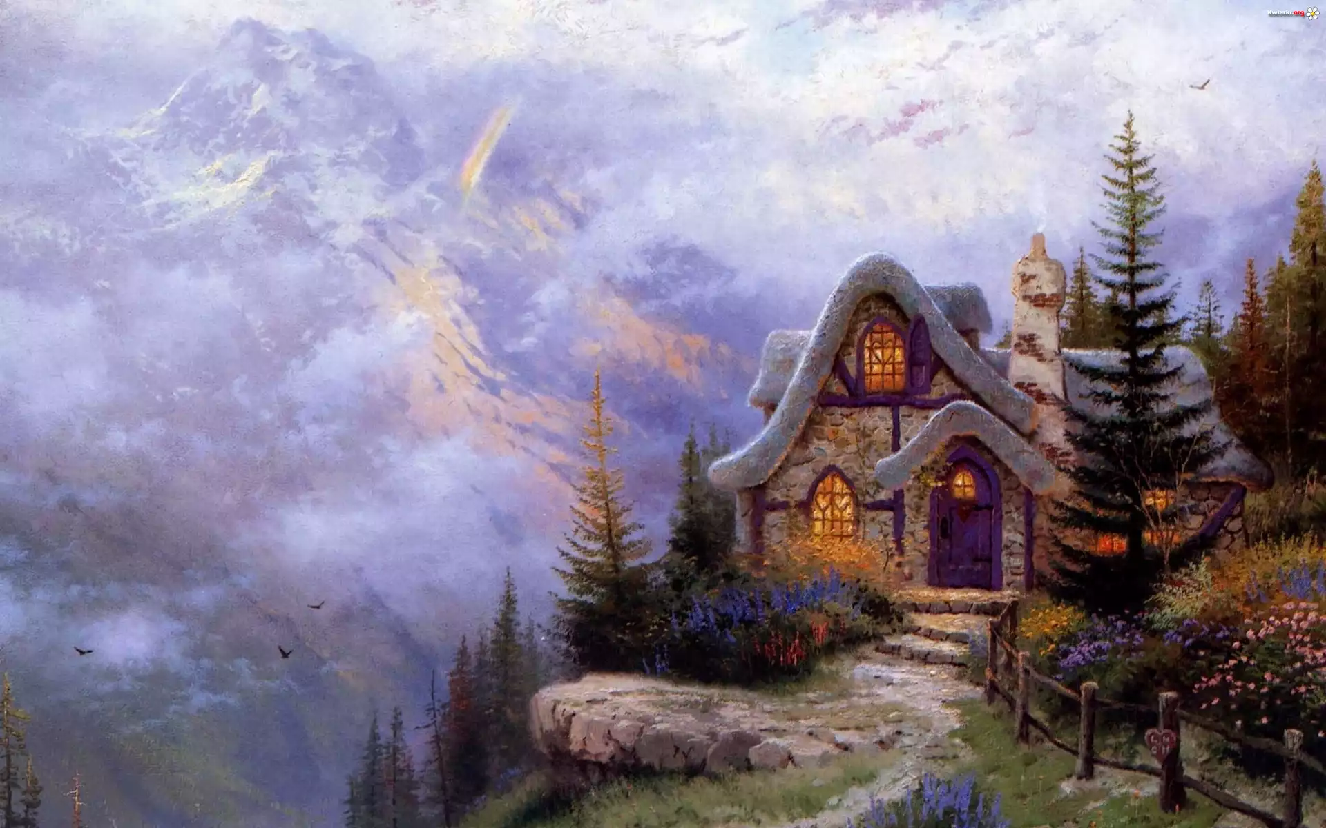 Dom, Lasy, Góry, Kwiaty, Reprodukcja, Obrazu - Zdjęcia