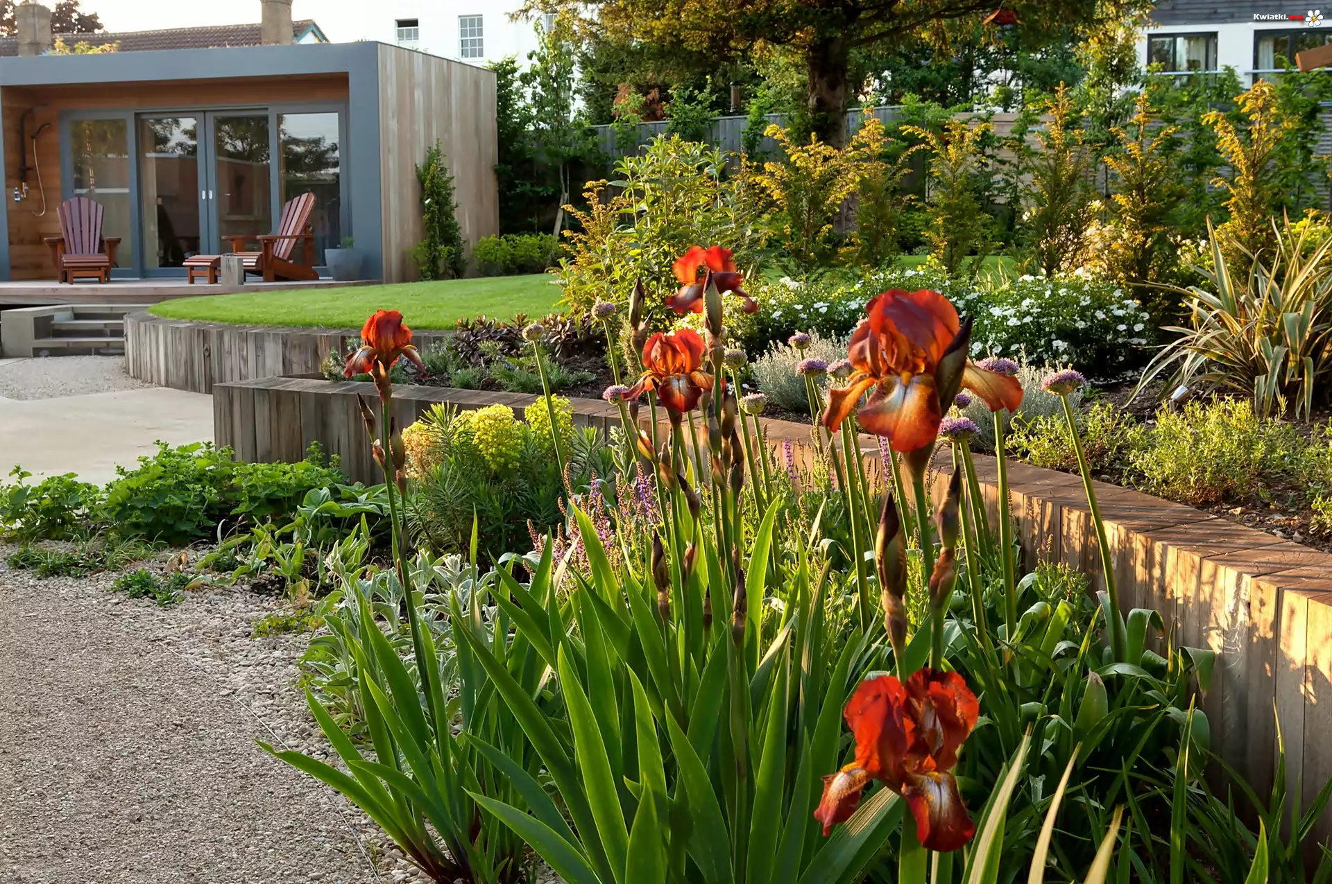 Domy, Ogród, Czerwone, Irysy - Zdjęcia