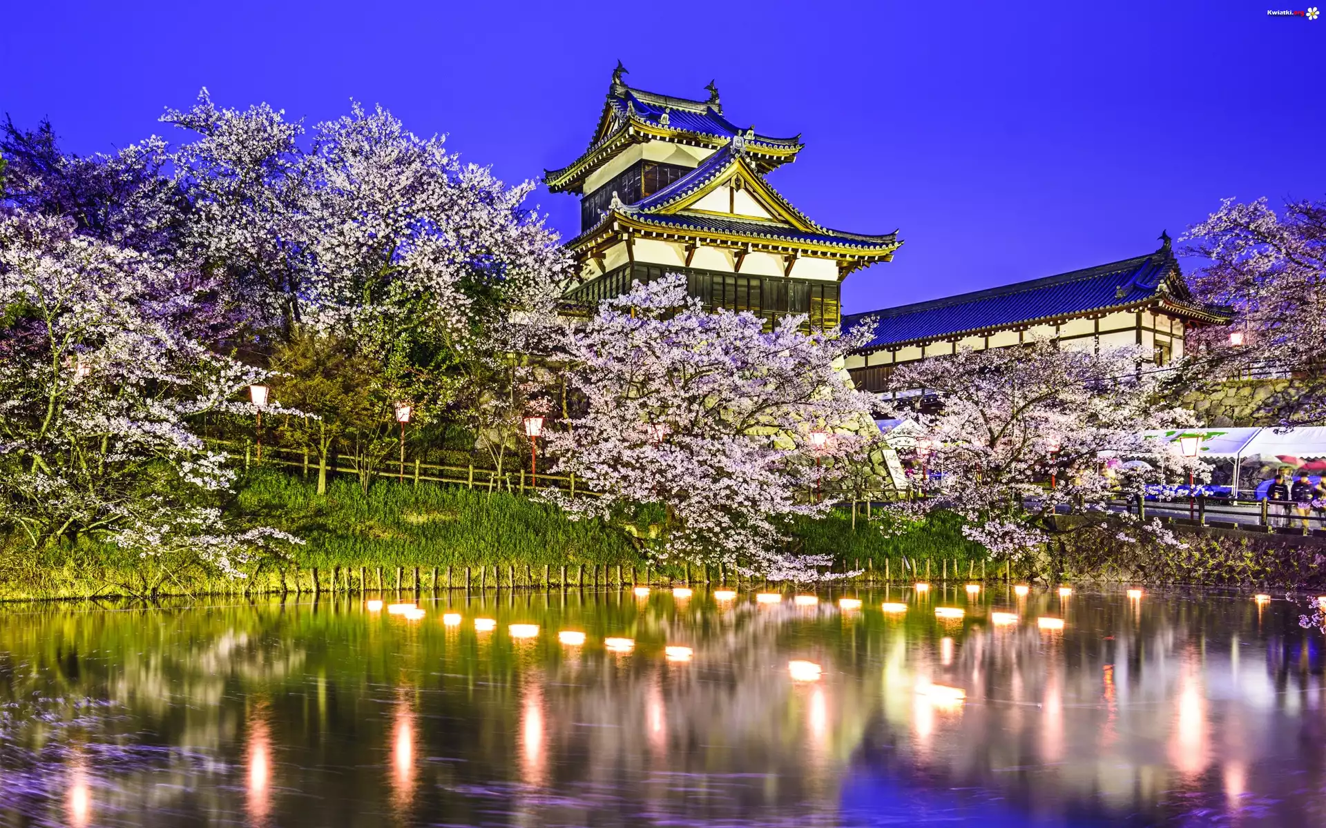 Kwiat Japońskie, Domy, Kwitnące, Drzewa, Rzeka, Wiosna, Japonia