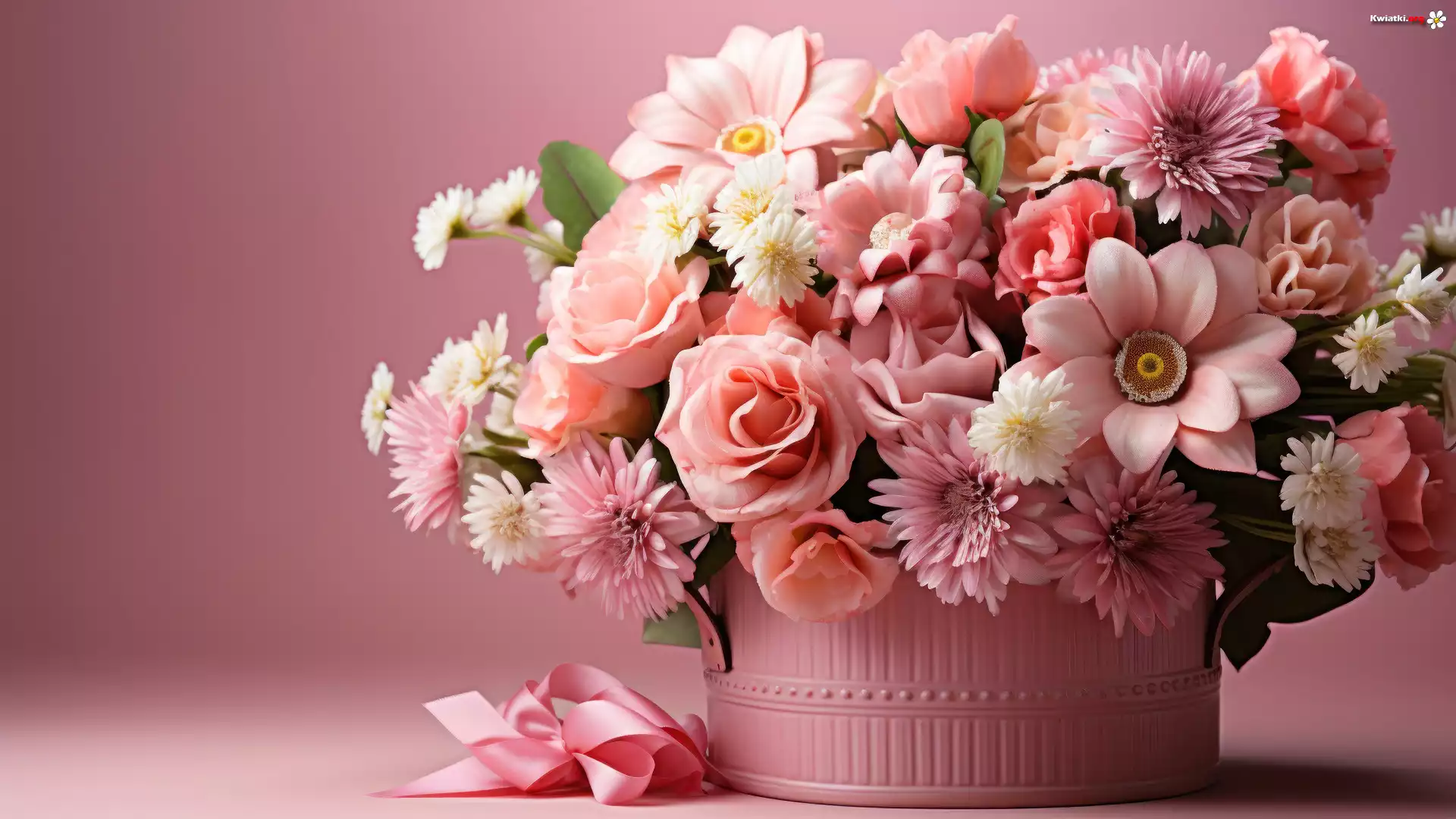 Kwiat Kwiaty, Różne, Bukiet, Donica, Kokarda, Różowe tło