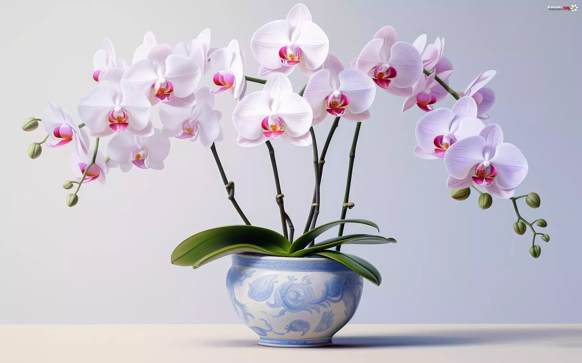 Kwiat Biało-różowe, Storczyki, Donica, Zielone, Listki