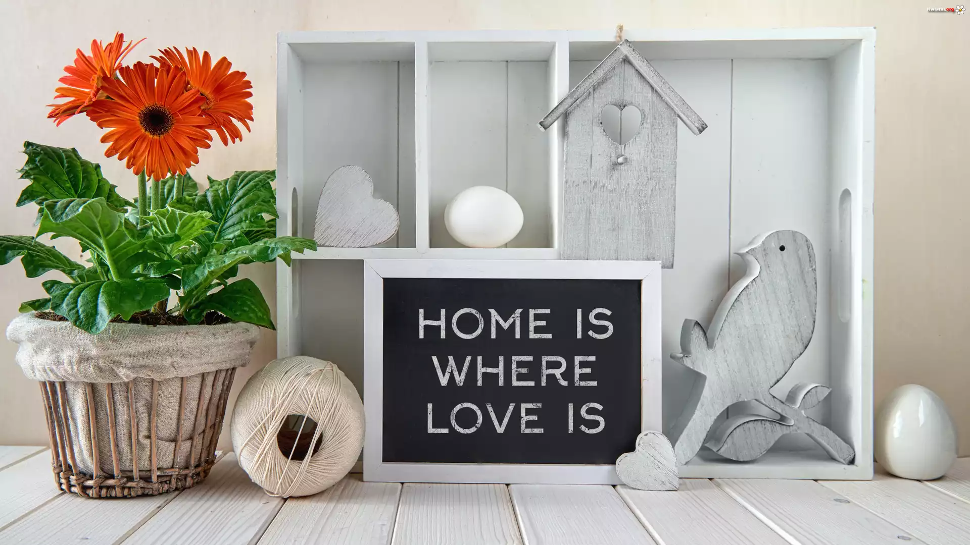 Kwiaty, Doniczka, Gerbera, Włóczka, Tabliczka, Napis, Serce, Dekoracje - Zdjęcia
