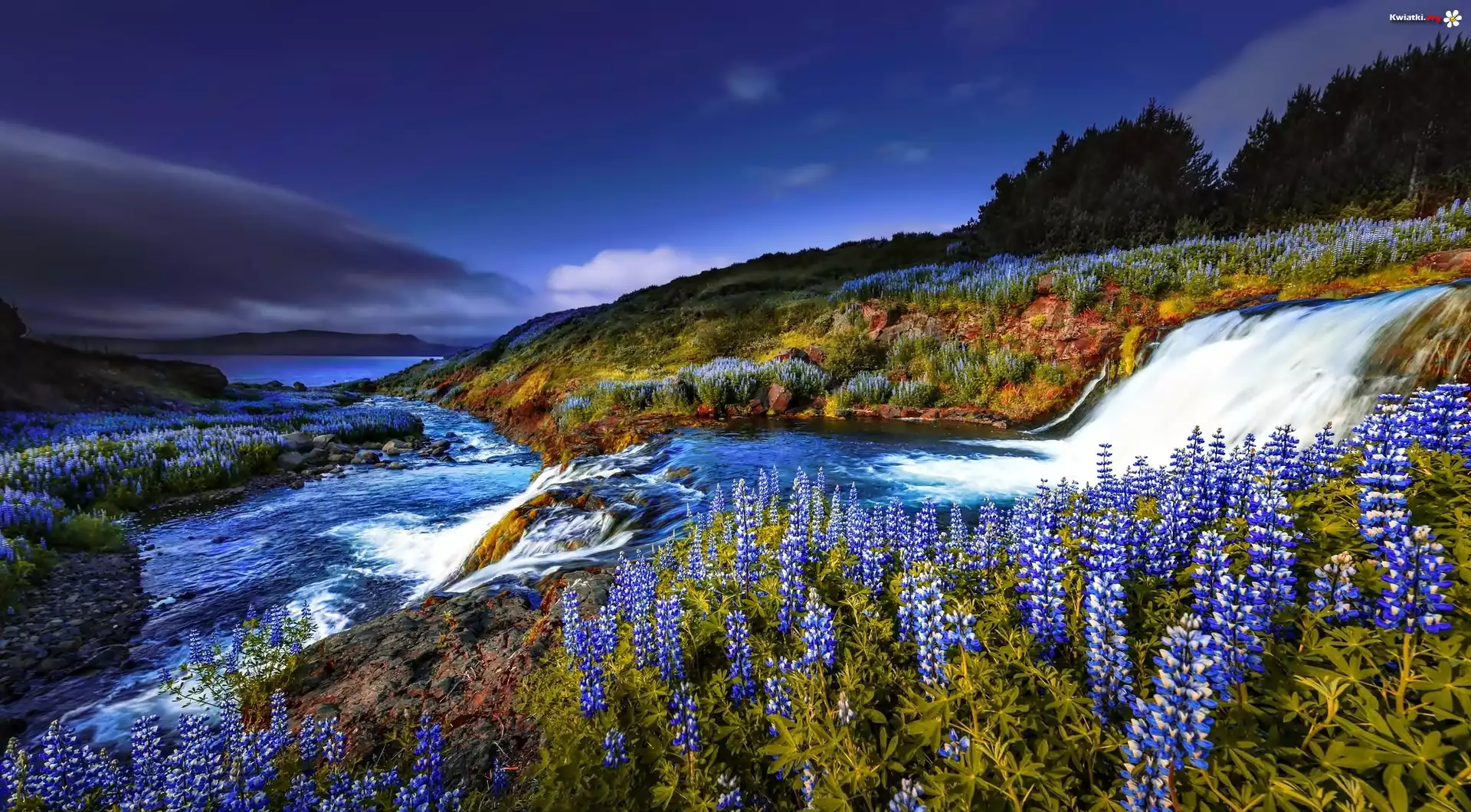 Kwiat Rzeka, Dopływ, Jeziora, Wzgórza, Drzewa, Kwiaty, Łubin
