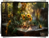 Kwiat Słoneczniki ozdobne, Wazon, Drewniany, Stół, Grafika AI