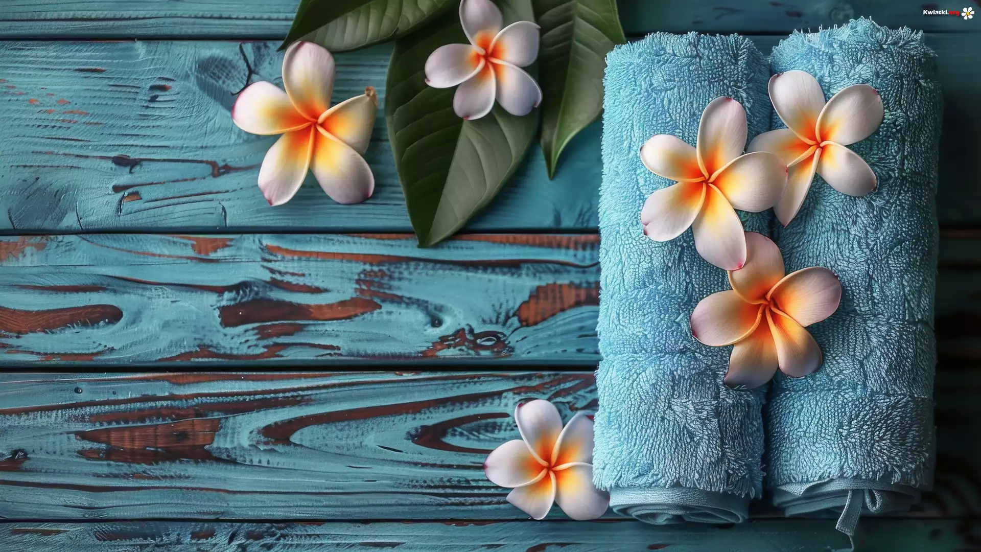 Kwiat, Plumeria, Ręczniki, Drewno, Deski, Kompozycja - Zdjęcia