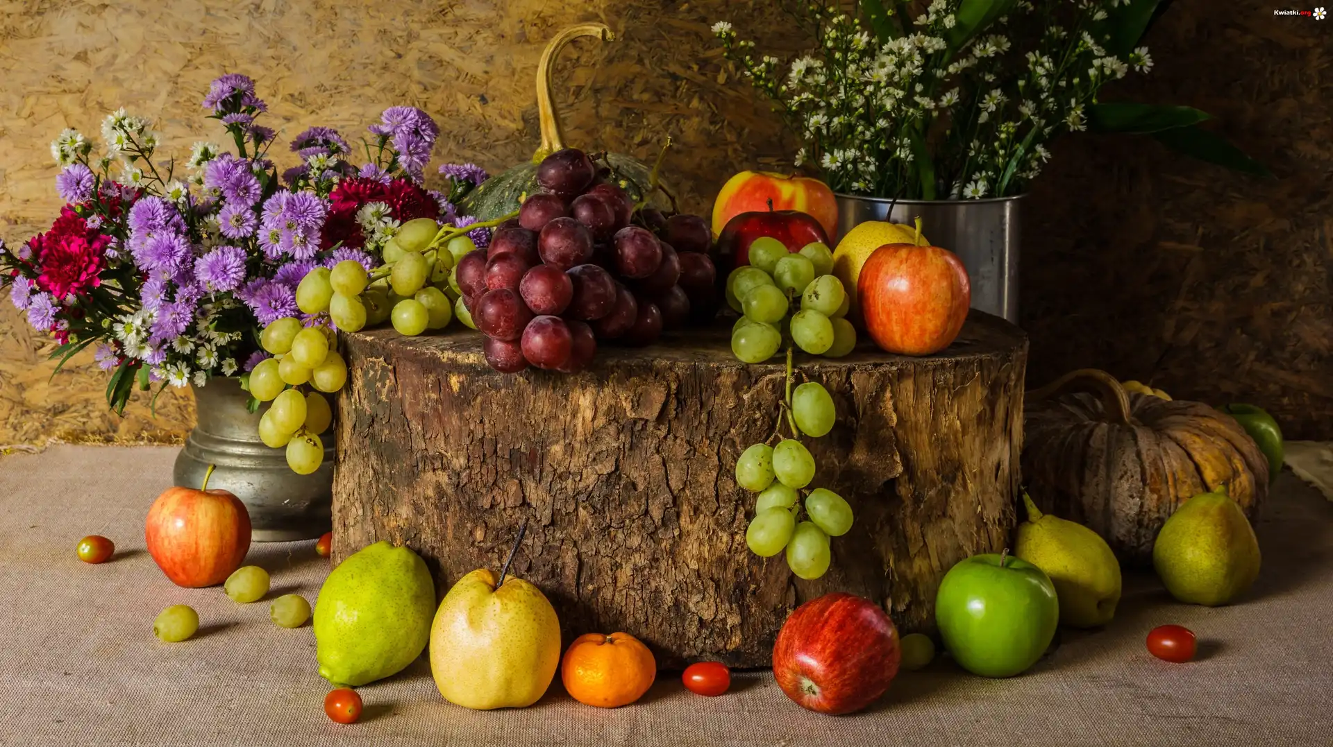 Kwiat Astry marcinki, Kwiaty, Wazon, Owoce, Winogrona, Jabłka, Klocek, Drewno