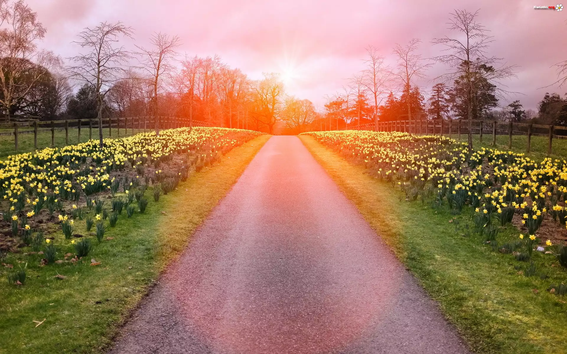 Droga, Żonkile, Blask, Drzewa - Zdjęcia