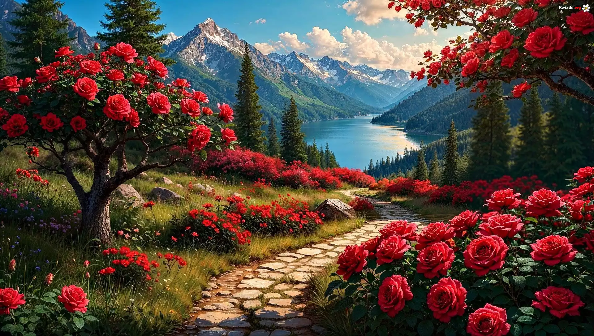 Róże, Droga, Góry, AI, Jezioro - Zdjęcia