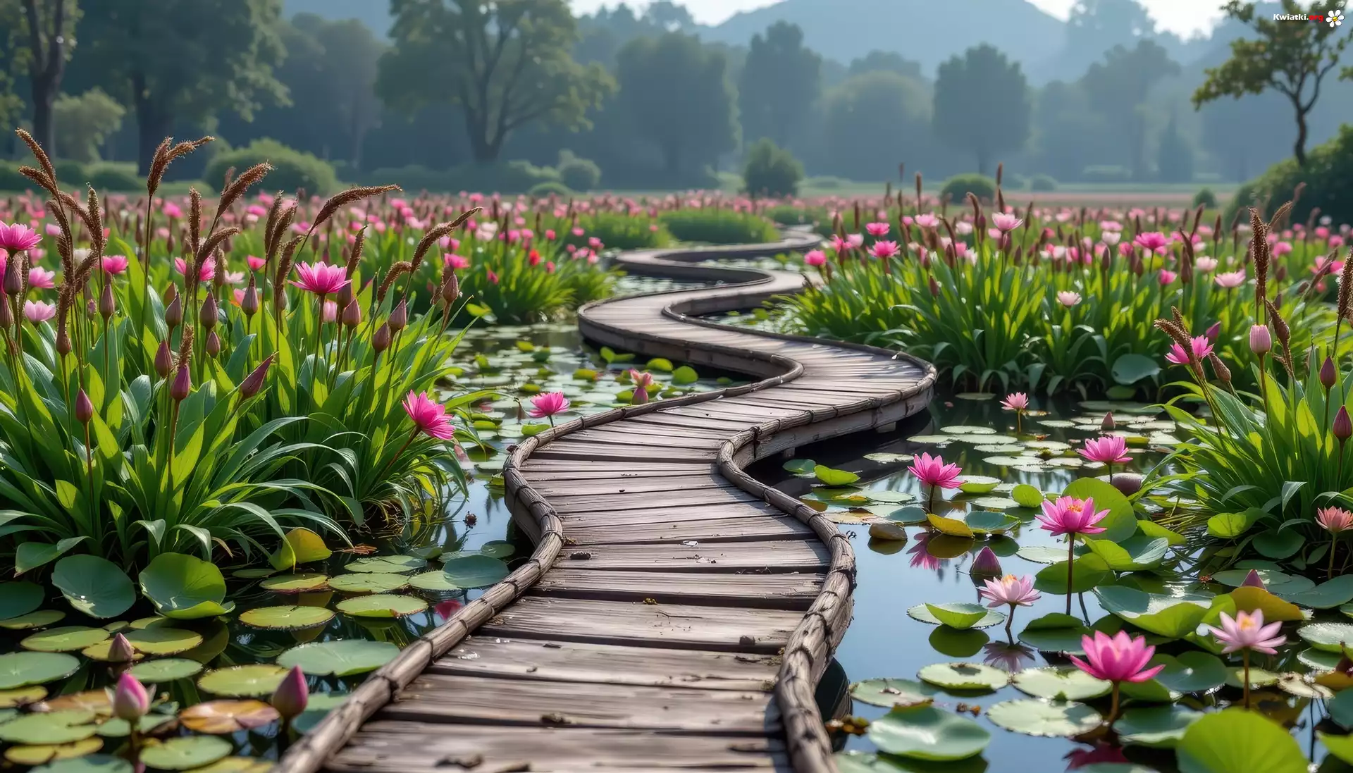 Kładka, Kwiaty, Lilie wodne, Kwitnące, Trzciny, Grafika Droga - Zdjęcia