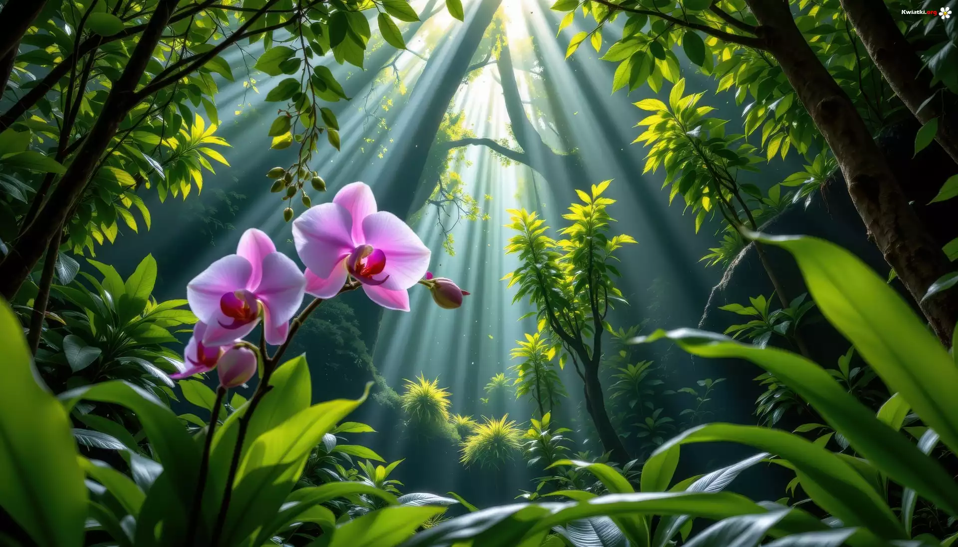 Drzewa, Rośliny, Kwiaty, Fioletowe, Storczyki, Przebijające światło, Grafika AI, Las - Zdjęcia