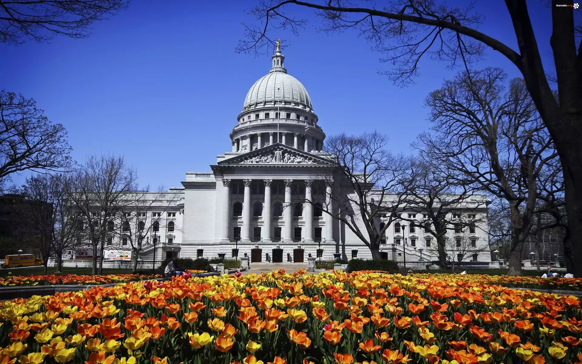 Budowla, Drzewa, Tulipany - Zdjęcia