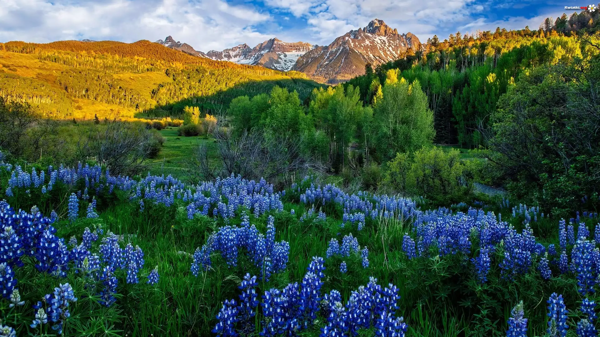 Stany Zjednoczone, Kolorado, Góry, San Juan Mountains, Mount Sneffels, Drzewa, Łąka, Łubin - Zdjęcia |