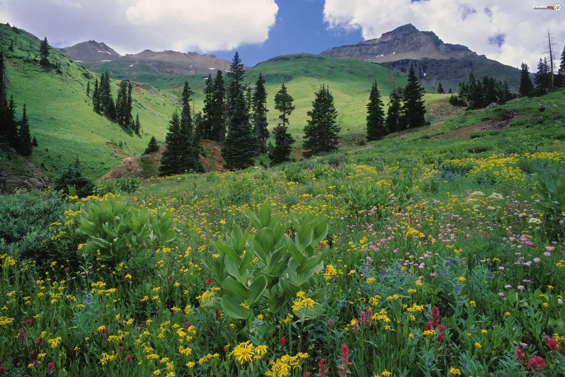 Kwiat Łąka, Kwiaty, Drzewa, Góry