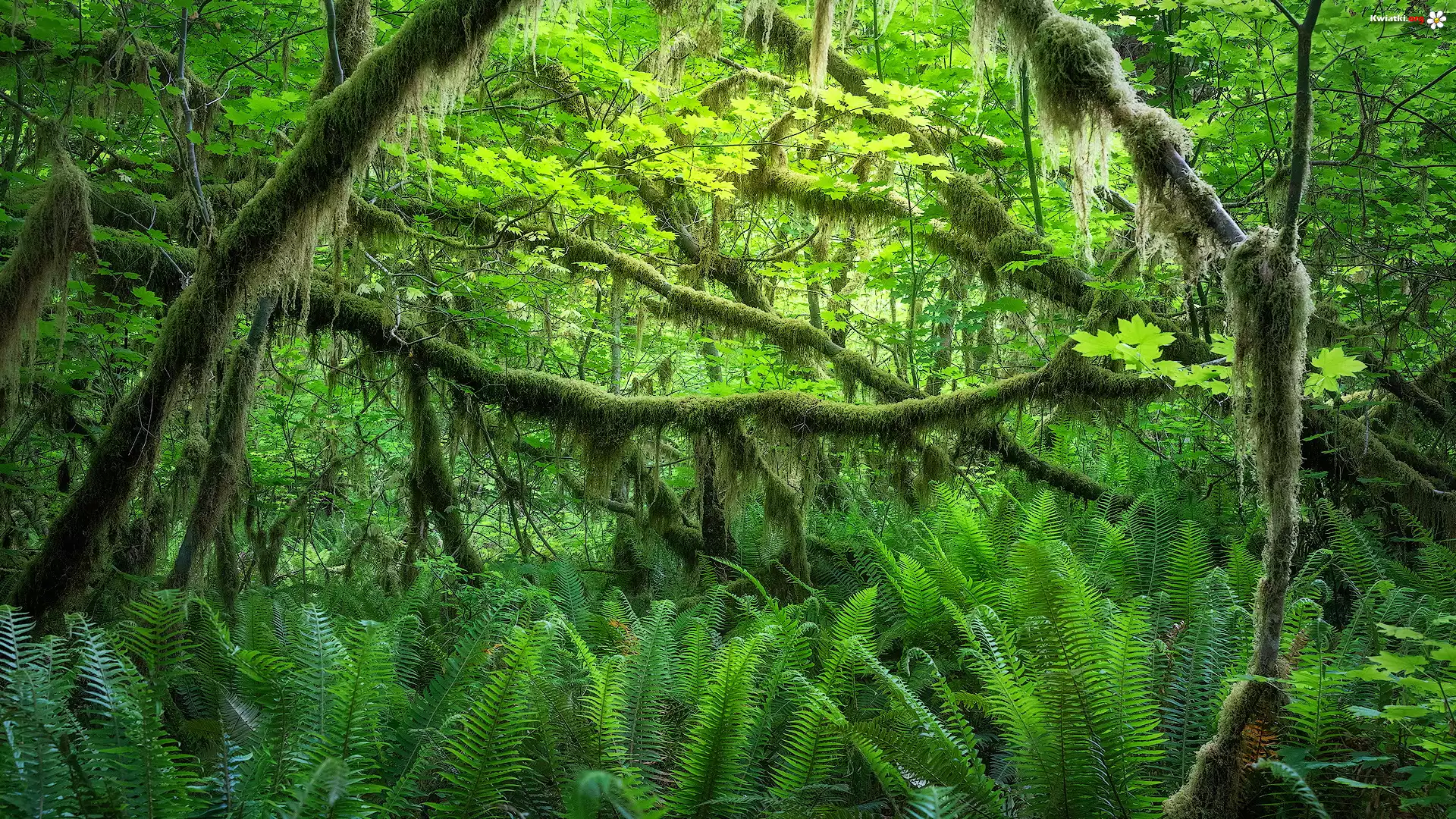 Las, Drzewa, Mech hiszpański, Oplątwa brodaczkowa, Paprocie - Zdjęcia