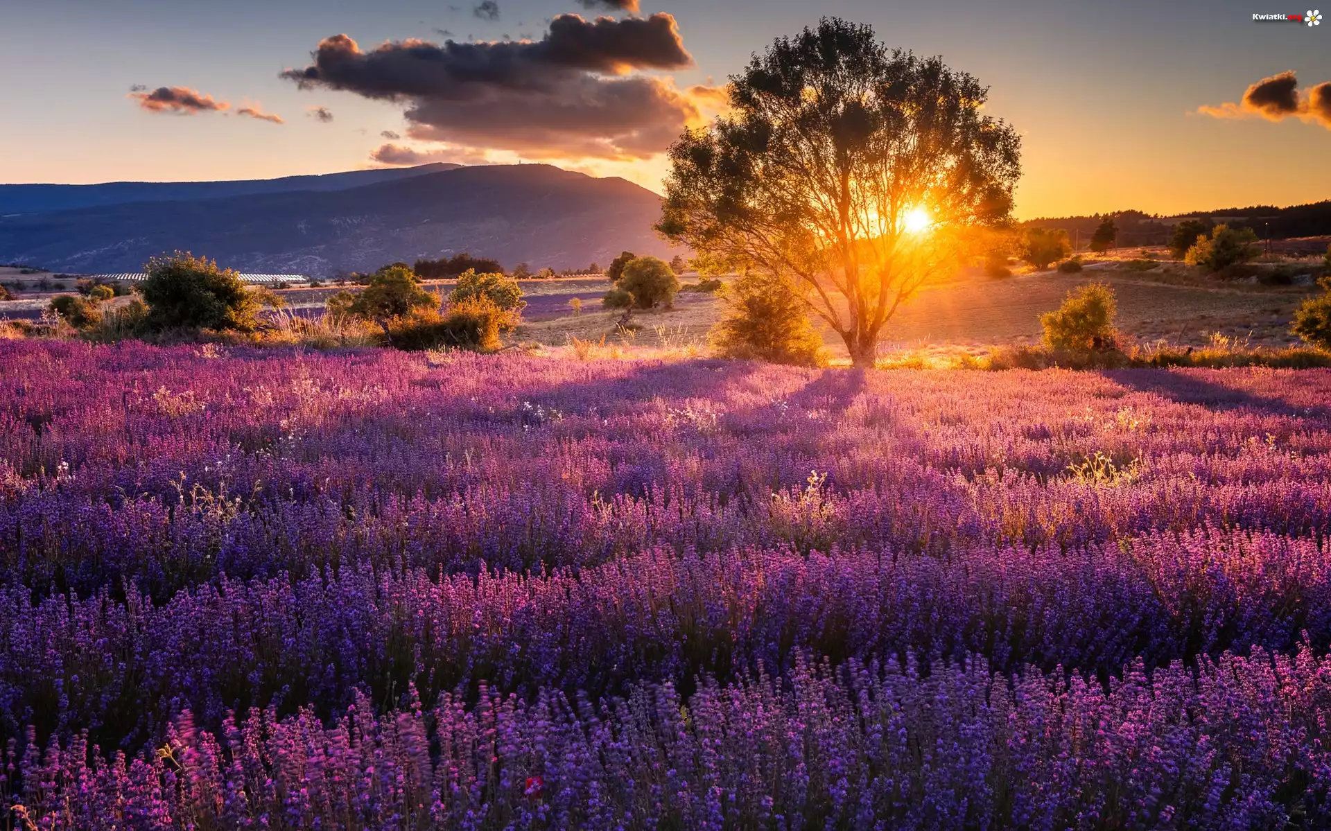 Kwiat Pole, Lawenda, Chmury, Drzewa, Zachód słońca
