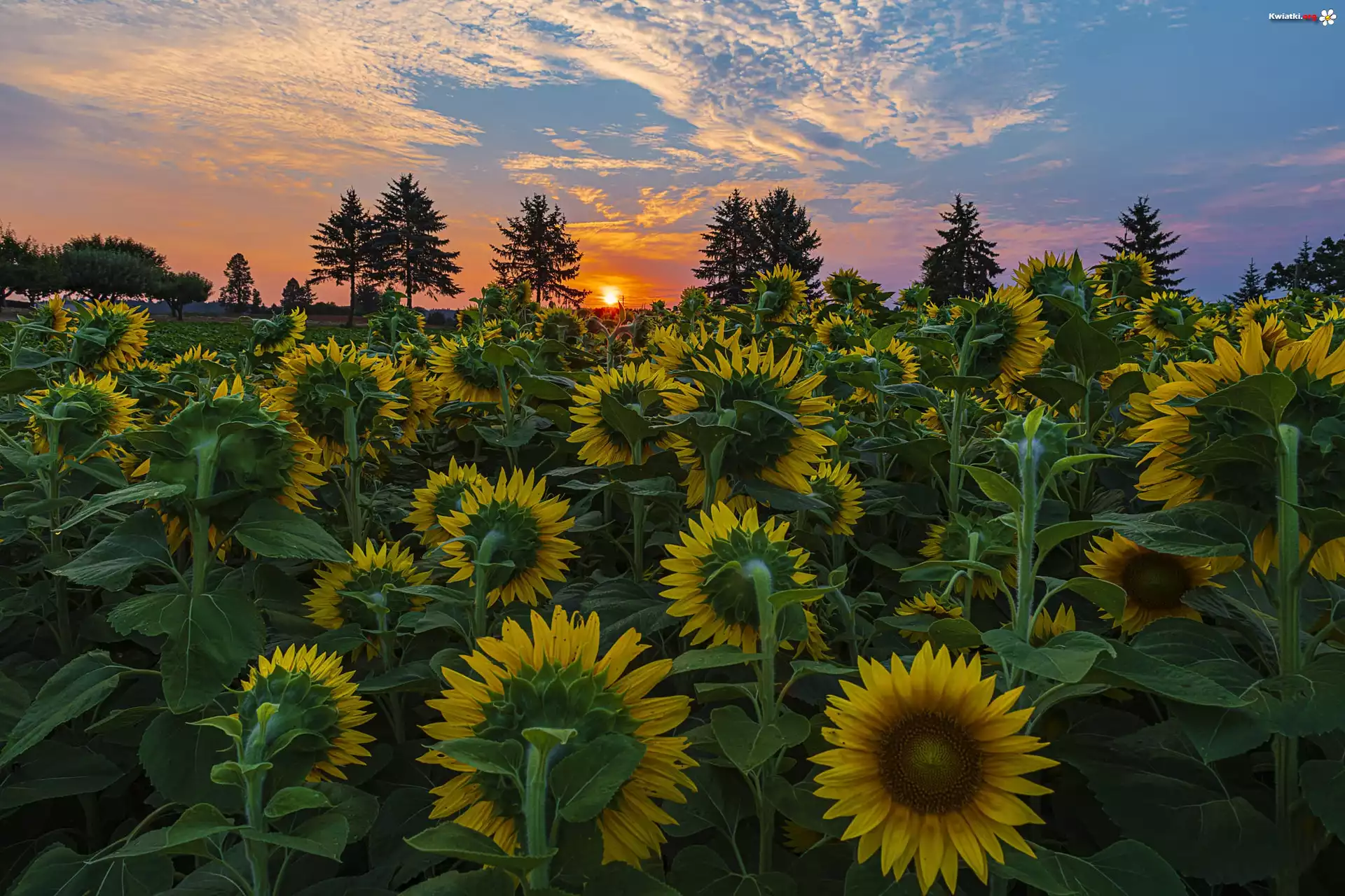 Kwiat Pole, Kwiaty, Słoneczniki, Drzewa, Niebo, Zachód słońca
