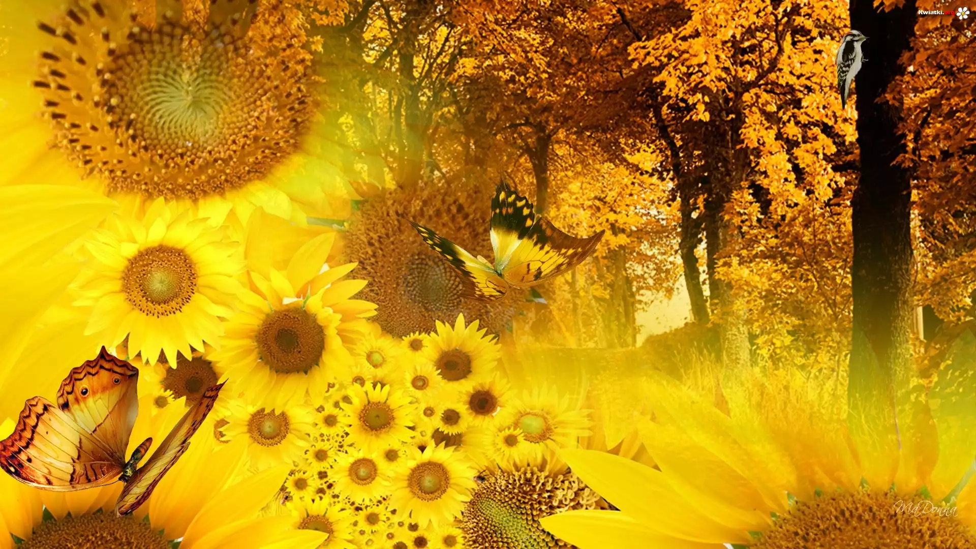 Słoneczniki, Drzewa, Motyle - Zdjęcia