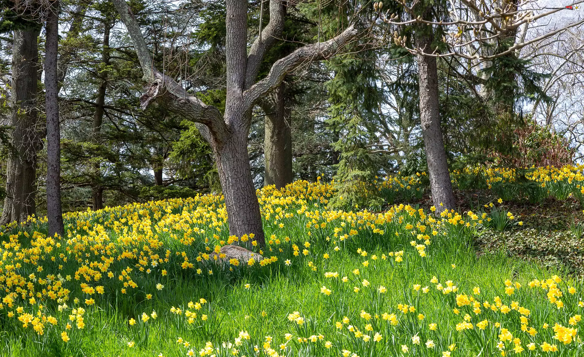 Żółte, Kwiaty, Żonkile, Drzewa - Zdjęcia