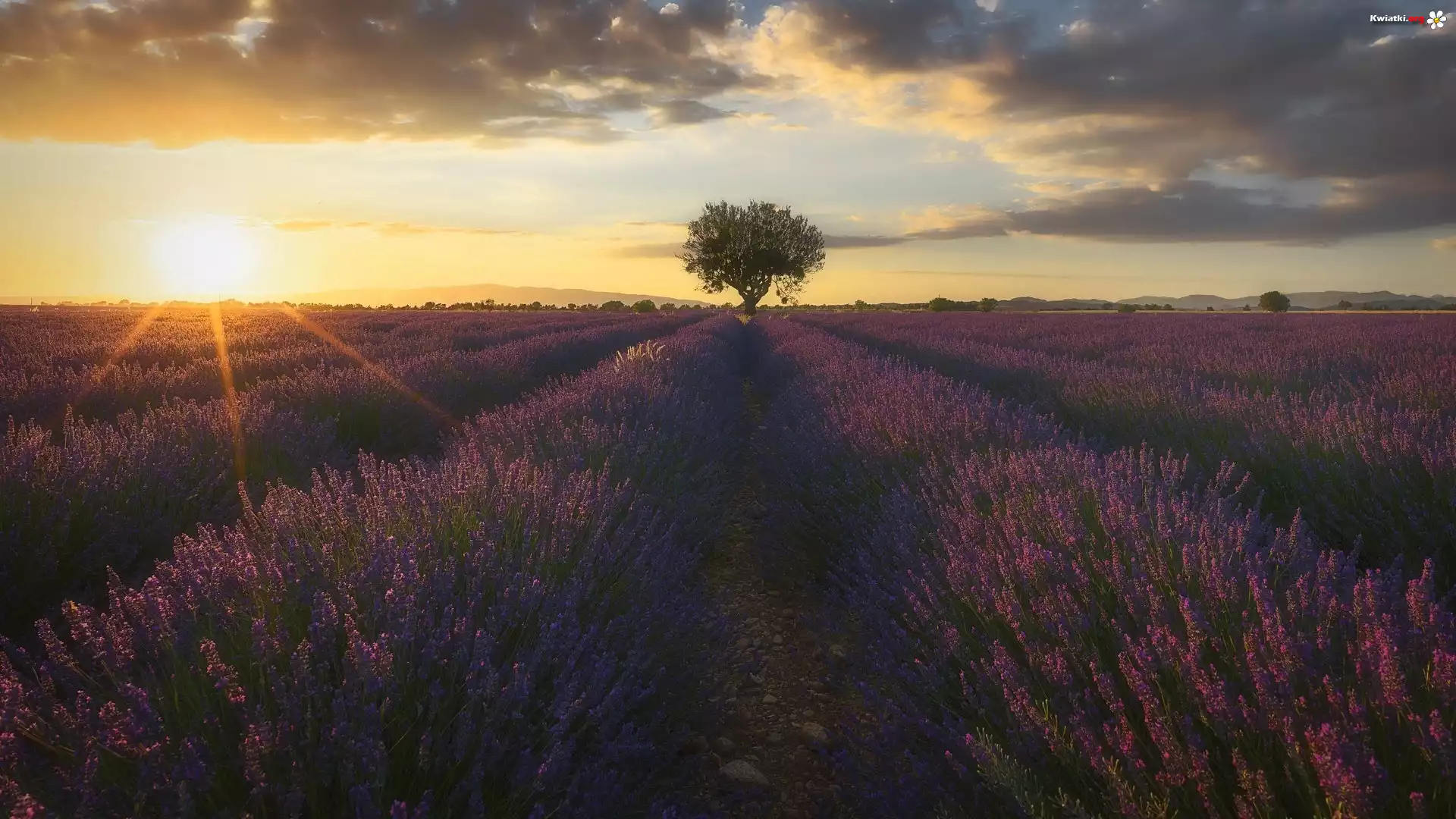 Pole, Kwiaty, Lawenda, Drzewo, Chmury, Promienie słońca - Zdjęcia