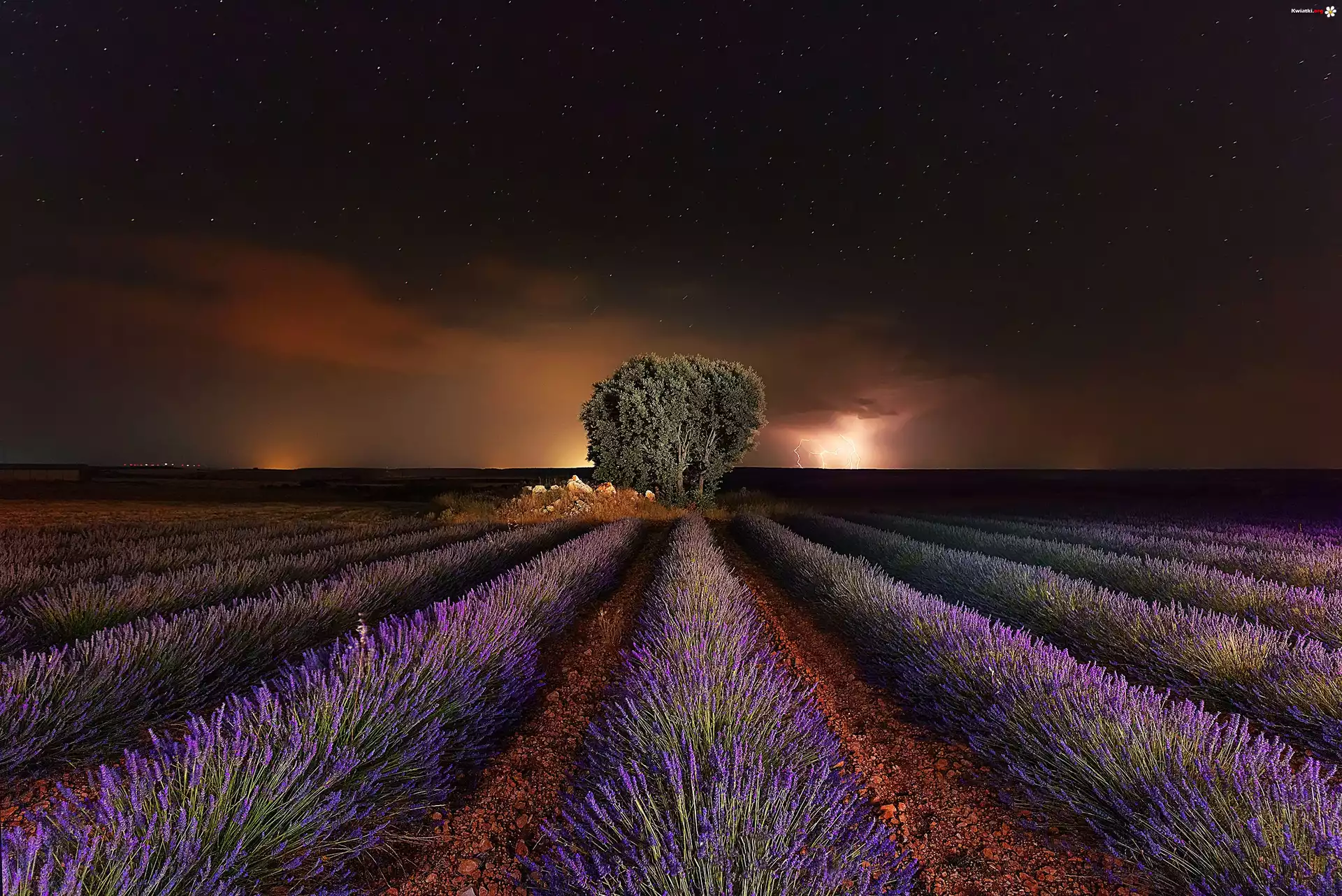Kwiat Drzewo, Pole, Lawenda, Burza, Noc, Gwiazdy