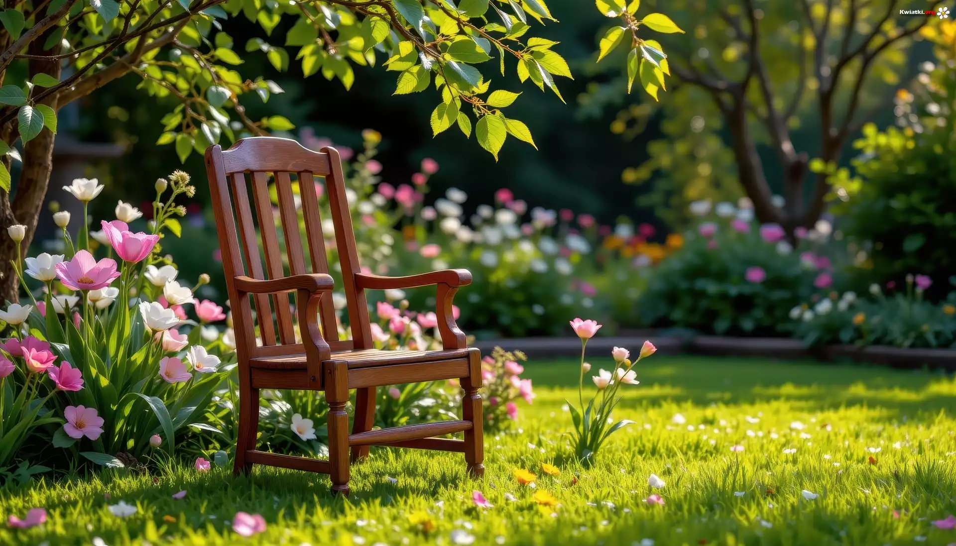 Ogród, Krzesło, Kwiaty, Drzewo - Zdjęcia