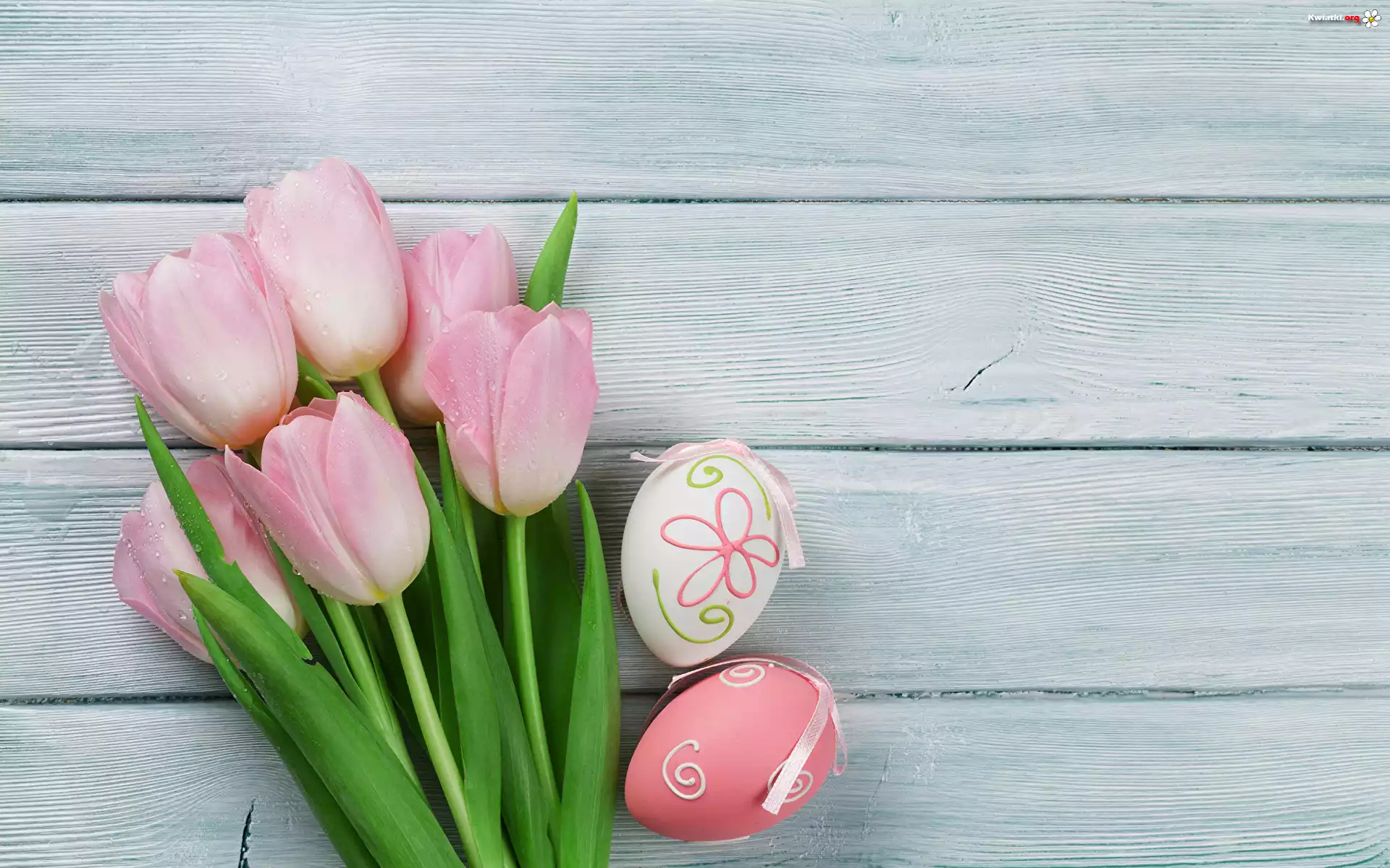 Kwiaty, Bladoróżowe, Tulipany, Dwie, Pisanki, Błękitne deski - Zdjęcia