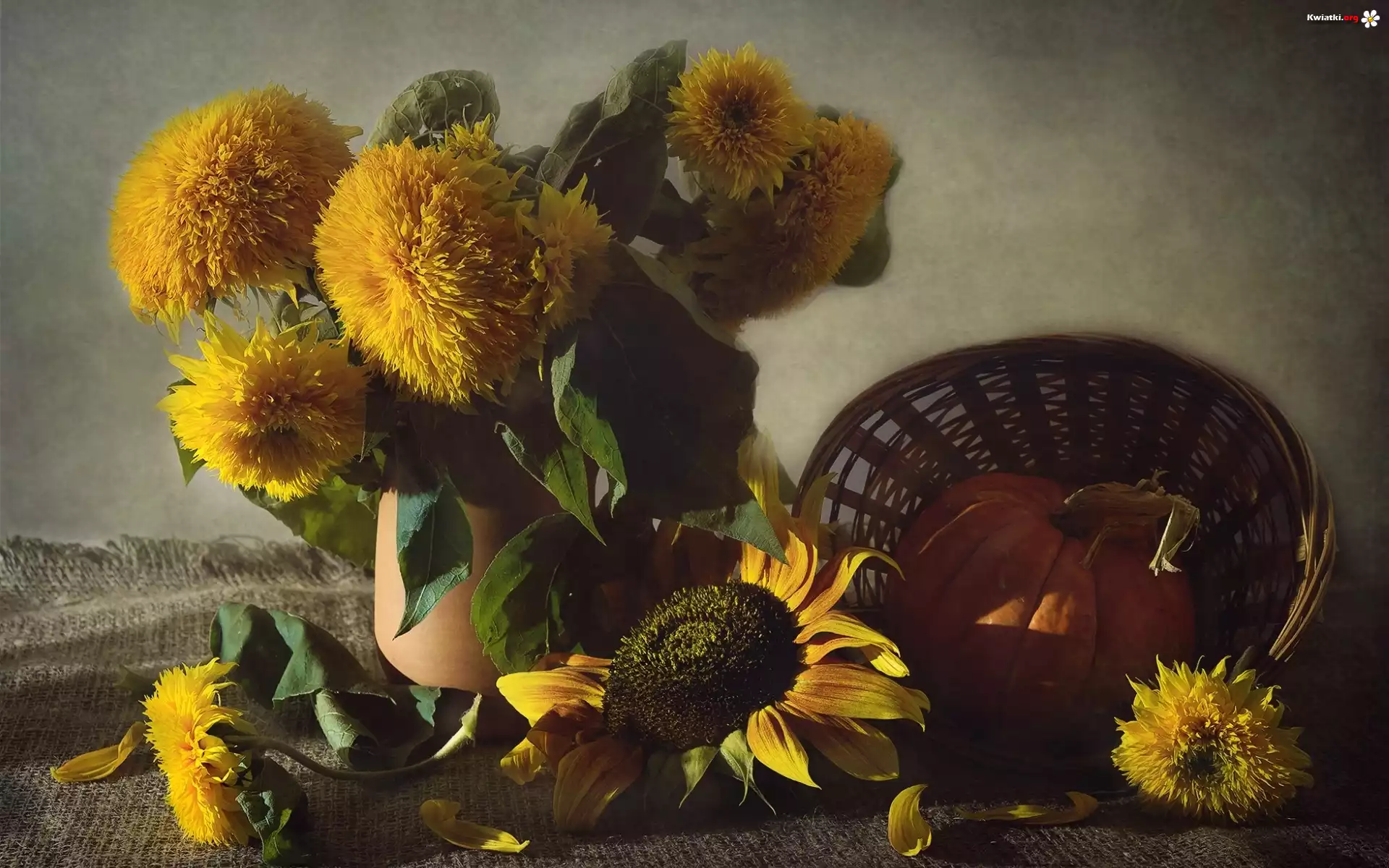 Kompozycja, Wazon, Bukiet, Słoneczniki ozdobne karłowe, Słonecznik zwyczajny, Koszyk, Dynia - Zdjęcia |